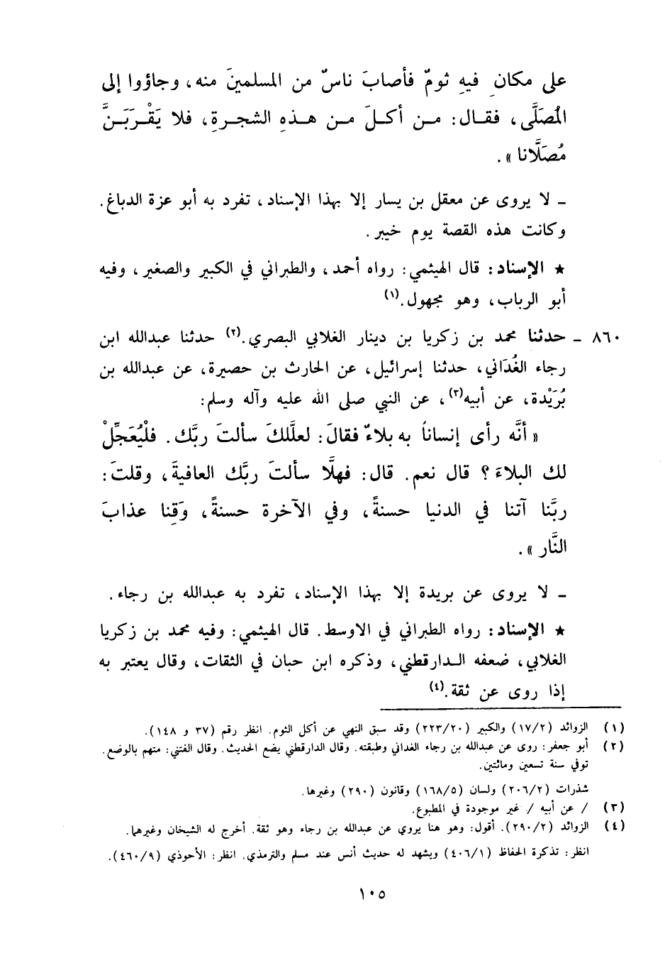 860 - حَدَّثَنَا مُحَمَّدٌ زَكَرِيَّا بْنُ دِينَارٍ الْغَلَابِيُّ الْبَصْرِيُّ، حَدَّثَنَا عَبْدُ اللَّهِ بْنُ رَجَاءٍ الْغُدَانِيُّ، حَدَّثَنَا إِسْرَائِيلُ، عَنِ الْحَارِثِ بْنِ حَصِيرَةَ، عَنْ عَبْدِ اللَّهِ بْنِ بُرَيْدَةَ، عَنْ أَبِيهِ، عَنِ النَّبِيِّ صَلَّى اللَّهُ عَلَيْهِ وَآلِهِ وَسَلَّمَ أَنَّهُ رَأَى إِنْسَانًا بِهِ بَلَاءٌ , فَقَالَ: «لَعَلَّكَ سَأَلْتَ رَبَّكَ فَلْيُعَجِّلْ لَكَ الْبَلَاءَ؟» قَالَ: نَعَمْ قَالَ: " §فَهَلَّا سَأَلْتَ رَبَّكَ الْعَافِيَةَ , وَقُلْتَ: {رَبَّنَا آتِنَا فِي الدُّنْيَا حَسَنَةً , وَفِي الْآخِرَةِ حَسَنَةً , وَقِنَا عَذَابَ النَّارِ} [البقرة: 201] " لَا يُرْوَى عَنْ بُرَيْدَةَ إِلَّا بِهَذَا الْإِسْنَادِ تَفَرَّدَ بِهِ عَبْدُ اللَّهِ بْنُ رَجَاءٍ