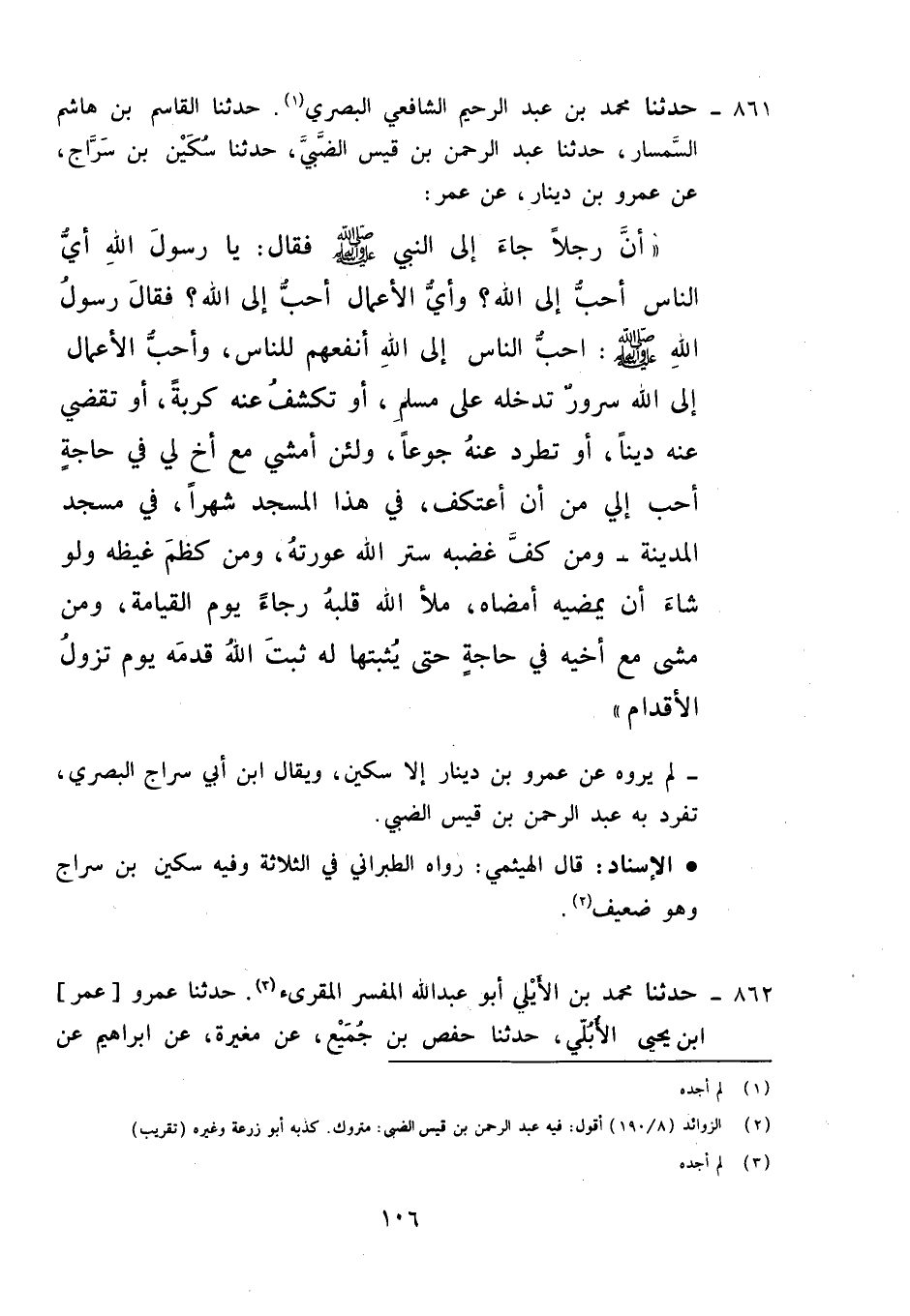 861 - حَدَّثَنَا مُحَمَّدُ بْنُ عَبْدِ الرَّحِيمِ الشَّافِعِيُّ الْبَصْرِيُّ، حَدَّثَنَا الْقَاسِمُ بْنُ هَاشِمٍ السِّمْسَارُ، حَدَّثَنَا عَبْدُ الرَّحْمَنِ بْنُ قَيْسٍ الضَّبِّيُّ، حَدَّثَنَا سِكِّينُ بْنُ سِرَاجٍ، عَنْ عَمْرِو بْنِ دِينَارٍ، عَنْ عُمَرَ، أَنَّ رَجُلًا، جَاءَ إِلَى النَّبِيِّ صَلَّى اللَّهُ عَلَيْهِ وَآلِهِ وَسَلَّمَ , فَقَالَ: يَا رَسُولَ اللَّهِ , أَيُّ النَّاسِ أَحَبُّ إِلَى اللَّهِ , وَأَيُّ الْأَعْمَالِ أَحَبُّ إِلَى اللَّهِ؟ فَقَالَ رَسُولُ اللَّهِ صَلَّى اللَّهُ عَلَيْهِ وَآلِهِ وَسَلَّمَ: «§أَحَبُّ النَّاسِ إِلَى اللَّهِ أَنْفَعُهُمْ لِلنَّاسِ , وَأَحَبُّ الْأَعْمَالِ إِلَى اللَّهِ سُرُورٌ تُدْخِلُهُ عَلَى مُسْلِمٍ , أَوْ تَكْشِفُ عَنْهُ كُرْبَةً , أَوْ تَقْضِي عَنْهُ دَيْنًا , أَوْ تَطْرُدُ عَنْهُ جُوعًا، وَلَئِنْ أَمْشِي مَعَ أَخٍ لِي فِي حَاجَةٍ أَحَبُّ إِلَيَّ مِنْ أَنْ أَعْتَكِفَ فِي هَذَا الْمَسْجِدِ شَهْرًا فِي مَسْجِدِ الْمَدِينَةِ , وَمَنْ كَفَّ غَضَبَهُ سَتَرَ اللَّهُ عَوْرَتَهُ , وَمَنْ كَظَمَ غَيْظَهُ وَلَوْ شَاءَ أَنْ يُمْضِيَهُ أَمْضَاهُ؛ مَلَأَ اللَّهُ قَلْبَهُ رَجَاءً يَوْمَ الْقِيَامَةِ , وَمَنْ مَشَى مَعَ أَخِيهِ فِي حَاجَةٍ حَتَّى يُثَبِّتَهَا لَهُ ثَبَّتَ اللَّهُ قَدَمَهُ يَوْمَ تَزُولُ الْأَقْدَامُ» لَمْ يَرْوِهِ عَنْ عَمْرٍو بْنِ دِينَارٍ إِلَّا سِكِّينُ بْنُ سِرَاجٍ , وَيُقَالُ: ابْنُ أَبِي سِرَاجٍ الْبَصْرِيُّ، تَفَرَّدَ بِهِ عَبْدُ الرَّحْمَنِ بْنُ قَيْسٍ الضَّبِّيُّ