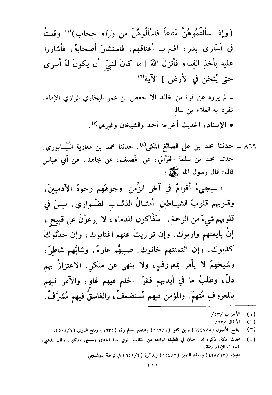 869 - حَدَّثَنَا مُحَمَّدُ بْنُ عَلِيٍّ الصَّائِغُ الْبَصْرِيُّ الْمَكِّيُّ، حَدَّثَنَا مُحَمَّدُ بْنُ مُعَاوِيَةَ النَّيْسَابُورِيُّ، حَدَّثَنَا مُحَمَّدُ بْنُ سَلَمَةَ الْحَرَّانِيُّ، عَنْ خَصِيفٍ، عَنْ مُجَاهِدٍ، عَنِ ابِنِ عَبَّاسٍ قَالَ: قَالَ رَسُولُ اللَّهِ صَلَّى اللَّهُ عَلَيْهِ وَآلِهِ وَسَلَّمَ: «§سَيَجِيءُ أَقْوَامٌ فِي آخِرِ الزَّمَنِ وُجُوهُهُمْ وُجُوهُ الْآدَمَيِّينَ , وَقُلُوبُهُمْ قُلُوبُ الشَّيَاطِينِ , أَمْثَالُ الذِّئَابِ الضَّوَارِي، لَيْسَ فِي قُلُوبِهِمْ شَيْءٌ مِنَ الرَّحْمَةِ , سَفَّاكُونَ الدِّمَاءَ , لَا يَرْعَوُونَ عَنْ قَبِيحٍ , إِنْ بَايَعْتَهُمْ وَارَبُوكَ , وَإِنْ تَوَارَيْتَ عَنْهُمُ اغْتَابُوكَ , وَإِنْ حَدَّثُوكَ كَذَّبُوكَ , وَإِنِ ائْتَمَنْتَهُمْ خَانُوكَ , صَبِيُّهُمْ عَارِمٌ , وَشَابُّهُمْ شَاطِرٌ , وَشَيْخُهُمْ لَا يَأْمُرُ بِمَعْرُوفٍ وَلَا يَنْهَى عَنْ مُنْكَرٍ , الِاعْتِزَازُ بِهِمْ ذُلٌّ , وَطَلَبُ مَا فِي أَيْدِيهِمْ فَقْرٌ , الْحَلِيمُ فِيهِمْ غَاوٍ , وَالْآمِرُ فِيهِمْ بِالْمَعْرُوفِ مُتَّهَمٌ , وَالْمُؤْمِنُ فِيهِمْ مُسْتَضْعَفٌ , وَالْفَاسِقُ فِيهِمْ مُشَرَّفٌ , السُّنَّةُ فِيهِمْ بِدْعَةٌ , وَالْبِدْعَةُ فِيهِمْ سُنَّةٌ , فَعِنْدَ ذَلِكَ يُسَلِّطُ اللَّهُ عَلَيْهِمْ شِرَارَهُمْ , فَيَدْعُو خِيَارُهُمْ فَلَا يُسْتَجَابُ لَهُمْ» لَمْ يَرْوِهِ عَنْ خَصِيفٍ إِلَّا مُحَمَّدُ بْنُ سَلَمَةَ تَفَرَّدَ بِهِ مُحَمَّدُ بْنُ مُعَاوِيَةَ , وَلَا يُرْوَى عَنِ ابْنِ عَبَّاسٍ إِلَّا بِهَذَا الْإِسْنَادِ