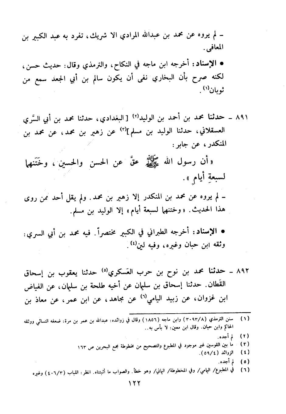 891 - حَدَّثَنَا مُحَمَّدُ بْنُ أَحْمَدَ بْنِ الْوَلِيدِ بْنِ مُسْلِمٍ، حَدَّثَنَا مُحَمَّدُ بْنُ أَبِي السَّرِيُّ الْعَسْقَلَانِيُّ، حَدَّثَنَا الْوَلِيدُ بْنُ مُسْلِمٍ، عَنْ زُهَيْرِ بْنِ مُحَمَّدٍ، عَنْ مُحَمَّدِ بْنِ الْمُنْكَدِرِ، عَنْ جَابِرٍ: أَنَّ رَسُولَ اللَّهِ صَلَّى اللَّهُ عَلَيْهِ وَآلِهِ وَسَلَّمَ «§عَقَّ عَنِ الْحَسَنِ وَالْحُسَيْنِ , وَخَتَنَهُمَا لَسَبْعَةِ أَيَّامٍ» لَمْ يَرْوِهِ عَنْ مُحَمَّدِ بْنِ الْمُنْكَدِرِ إِلَّا زُهَيْرُ بْنُ مُحَمَّدٍ، وَلَمْ يَقُلْ أَحَدٌ مِمَّنْ رَوَى هَذَا الْحَدِيثَ: «وَخَتَنَهُمَا لِسَبْعَةِ أَيَّامٍ» إِلَّا الْوَلِيدُ بْنُ مُسْلِمٍ
