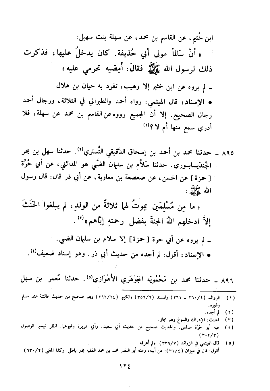 895 - حَدَّثَنَا مُحَمَّدُ بْنُ أَحْمَدَ بْنِ إِسْحَاقَ الدَّقِيقِيُّ التُّسْتَرِيُّ، حَدَّثَنَا سَهْلُ بْنُ بَحْرٍ الْجُنْدِيسَابُورِيُّ، حَدَّثَنَا سَلَّامُ بْنُ سُلَيْمَانَ الضَّبِّيُّ هُوَ الْمَدَائِنِيُّ , عَنْ أَبِي حُرَّةَ (حَمْزَةَ، عَنِ الْحَسَنِ، عَنْ صَعْصَعَةَ بْنِ مُعَاوِيَةَ، عَنْ أَبِي ذَرٍّ قَالَ: قَالَ رَسُولُ اللَّهِ صَلَّى اللَّهُ عَلَيْهِ وَآلِهِ وَسَلَّمَ: «§مَا مِنْ مُسْلِمَيْنِ يَمُوتُ لَهُمَا ثَلَاثَةٌ مِنَ الْوَلَدِ لَمْ يَبْلُغُوا مِنَ الْحِنْثِ إِلَّا أَدْخَلَهُمُ اللَّهُ الْجَنَّةَ بِفَضْلِ رَحْمَتِهِ إِيَّاهُمْ» لَمْ يَرْوِهِ عَنْ أَبِي حُرَّةَ (حَمْزَةَ) إِلَّا سَلَّامُ بْنُ سُلَيْمَانَ الضَّبِّيُّ