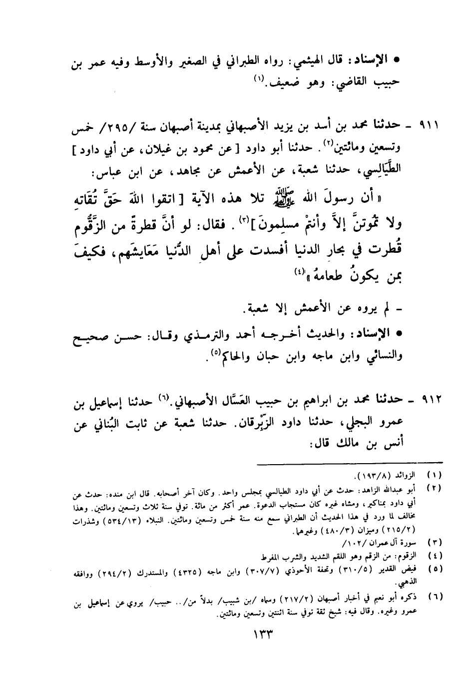 911 - حَدَّثَنَا مُحَمَّدُ بْنُ أَسَدِ بْنِ يَزِيدَ الْأَصْبَهَانِيُّ بِمَدِينَةِ أَصْبَهَانَ سَنَةَ 295 خَمْسٍ وَتِسْعِينَ وَمِائَتَيْنِ , حَدَّثَنَا أَبُو دَاوُدَ الطَّيَالِسِيُّ، حَدَّثَنَا شُعْبَةُ، عَنِ الْأَعْمَشِ، عَنْ مُجَاهِدٍ، عَنِ ابْنِ عَبَّاسٍ أَنَّ رَسُولَ اللَّهِ صَلَّى اللَّهُ عَلَيْهِ وَآلِهِ وَسَلَّمَ تَلَا هَذِهِ الْآيَةَ: {اتَّقُوا اللَّهَ حَقَّ تُقَاتِهِ وَلَا تَمُوتُنَّ إِلَّا وَأَنْتُمْ مُسْلِمُونَ} [آل عمران: 102] فَقَالَ: «§لَوْ أَنَّ قَطْرَةً مِنَ الزَّقُّومِ قُطِرَتْ فِي بِحَارِ الدُّنْيَا أَفْسَدَتْ عَلَى أَهْلِ الدُّنْيَا مَعَايِشَهُمْ , فَكَيْفَ بِمَنْ يَكُونُ طَعَامَهُ» لَمْ يَرْوِهِ عَنِ الْأَعْمَشِ إِلَّا شُعْبَةُ