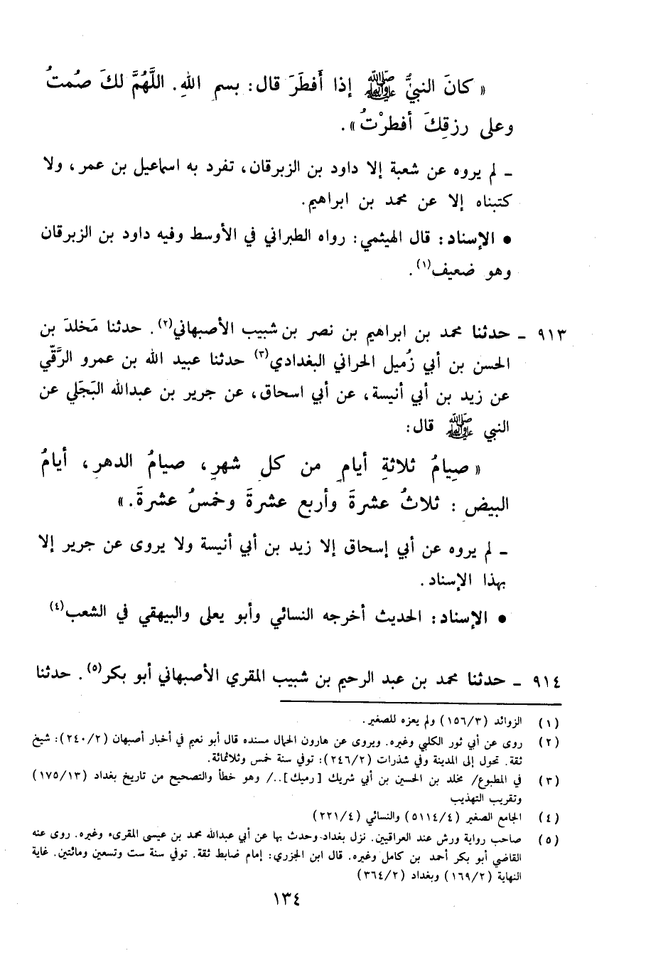 913 - حَدَّثَنَا مُحَمَّدُ بْنُ إِبْرَاهِيمَ بْنِ نَصْرِ بْنِ شَبِيبٍ الْأَصْبَهَانِيُّ، حَدَّثَنَا مَخْلَدُ بْنُ الْحُسَيْنِ بْنِ أَبِي شَرِيكٍ (رُمَيْكٍ) الْبَغْدَادِيُّ، حَدَّثَنَا عُبَيْدُ اللَّهِ بْنُ عَمْرٍو الرَّقِّيُّ، عَنْ زَيْدِ بْنِ أَبِي أُنَيْسَةَ، عَنْ أَبِي إِسْحَاقَ، عَنْ جَرِيرِ بْنِ عَبْدِ اللِّهِ الْبَجَلِيِّ، عَنِ النَّبِيِّ صَلَّى اللَّهُ عَلَيْهِ وَآلِهِ وَسَلَّمَ قَالَ: " §صِيَامُ ثَلَاثَةِ أَيَّامٍ مِنْ كُلِّ شَهْرٍ صِيَامُ الدَّهْرِ، أَيَّامُ الْبِيضِ: ثَلَاثَ عَشْرَةَ، وَأَرْبَعَ عَشْرَةَ، وَخَمْسَ عَشْرَةَ ". لَمْ يَرْوِهِ عَنْ أَبِي إِسْحَاقَ إِلَّا زَيْدُ بْنُ أَبِي أُنَيْسَةَ، وَلَا يُرْوَى عَنْ جَرِيرٍ إِلَّا بِهَذَا الْإِسْنَادِ