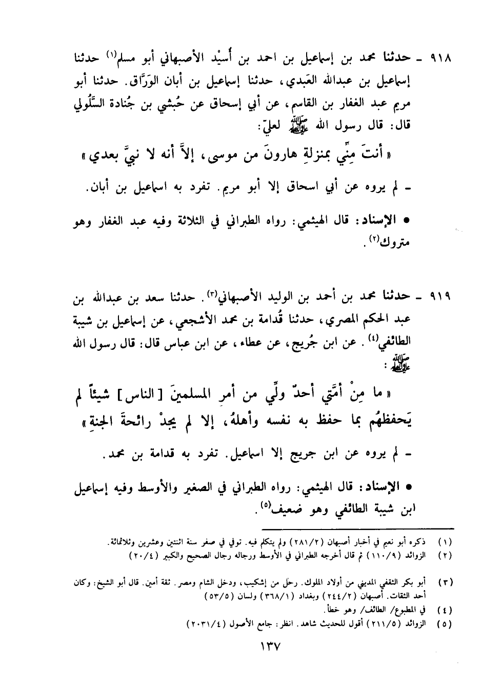 918 - حَدَّثَنَا مُحَمَّدُ بْنُ إِسْمَاعِيلَ بْنِ أَحْمَدَ بْنِ أُسَيْدٍ الْأَصْبَهَانِيُّ أَبُو مُسْلِمٍ، حَدَّثَنَا إِسْمَاعِيلُ بْنُ عَبْدِ اللَّهِ الْعَبْدِيُّ، حَدَّثَنَا إِسْمَاعِيلُ بْنُ أَبَانَ الْوَرَّاقُ، حَدَّثَنَا أَبُو مَرْيَمَ عَبْدُ الْغَفَّارِ بْنُ الْقَاسِمِ، عَنْ أَبِي إِسْحَاقَ، عَنْ حُبْشِيِّ بْنِ جُنَادَةَ السَّلُولِيِّ قَالَ: قَالَ رَسُولُ اللَّهِ صَلَّى اللَّهُ عَلَيْهِ وَآلِهِ وَسَلَّمَ لِعَلِيٍّ كَرَّمَ اللَّهُ وَجْهَهُ فِي الْجَنَّةِ: «§أَنْتَ مِنِّي بِمَنْزِلَةِ هَارُونَ مِنْ مُوسَى , إِلَّا أَنَّهُ لَا نَبِيَّ بَعْدِي» لَمْ يَرْوِهِ عَنْ أَبِي إِسْحَاقَ إِلَّا أَبُو مَرْيَمَ تَفَرَّدَ بِهِ إِسْمَاعِيلُ بْنُ أَبَانَ