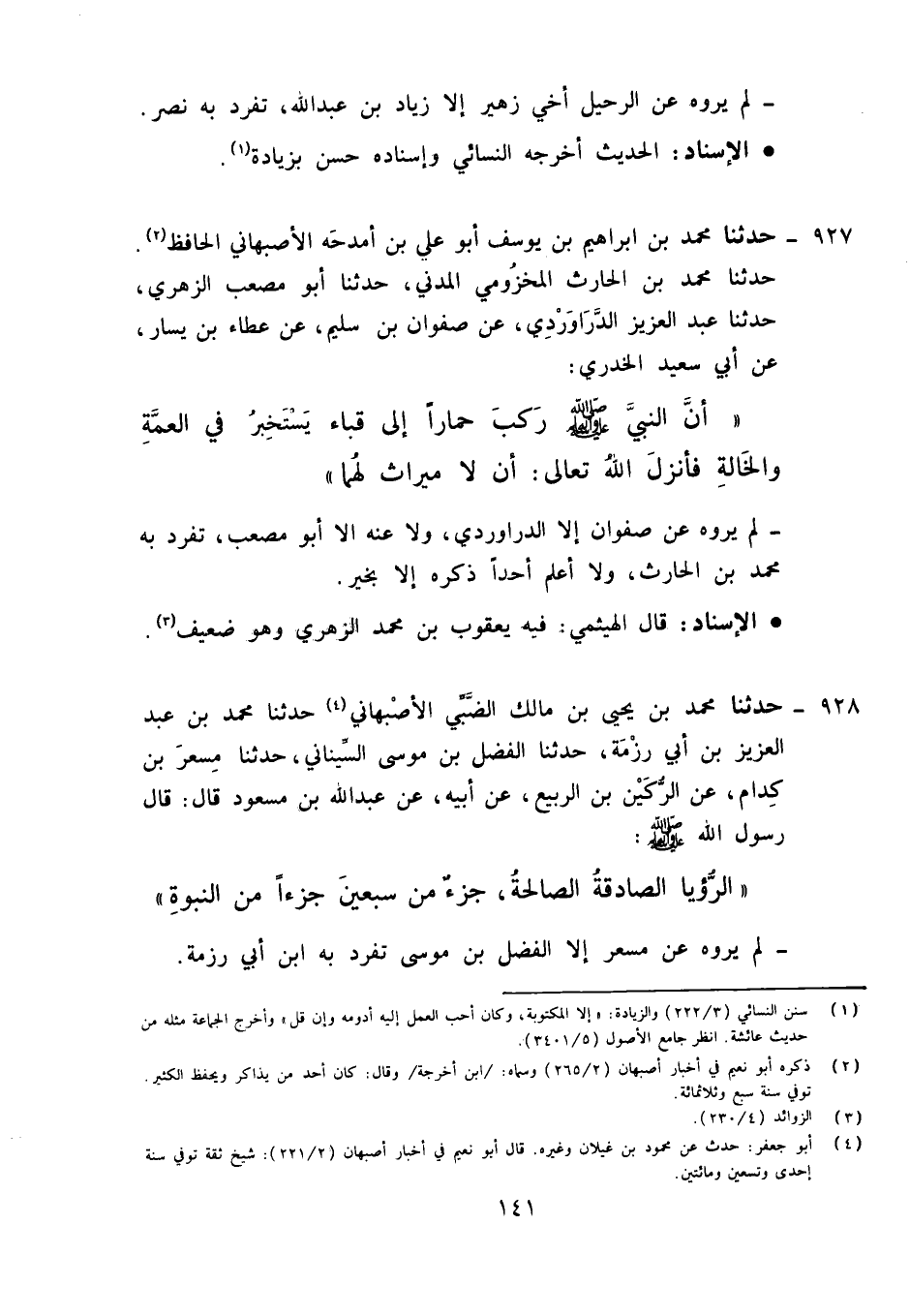 927 - حَدَّثَنَا مُحَمَّدُ بْنُ إِبْرَاهِيمَ بْنِ يُوسُفَ أَبُو عَلِيِّ بْنُ أَفْرَجَةَ الْأَصْبَهَانِيُّ الْحَافِظُ، حَدَّثَنَا مُحَمَّدُ بْنُ الْحَارِثِ الْمَخْزُومِيُّ الْمَدَنِيُّ، حَدَّثَنَا أَبُو مُصْعَبٍ الزُّهْرِيُّ، حَدَّثَنَا عَبْدُ الْعَزِيزِ بْنُ مُحَمَّدٍ الدَّرَاوَرْدِيُّ، عَنْ صَفْوَانَ بْنِ سُلَيْمٍ، عَنْ عَطَاءِ بْنِ يَسَارٍ، عَنْ أَبِي سَعِيدٍ الْخُدْرِيِّ: أَنَّ النَّبِيَّ صَلَّى اللَّهُ عَلَيْهِ وَآلِهِ وَسَلَّمَ رَكِبَ حِمَارًا إِلَى قُبَاءَ §يَسْتَخْبِرُ فِي الْعَمَّةِ وَالْخَالَةِ , فَأَنْزَلَ اللَّهُ تَعَالَى أَنْ «لَا مِيرَاثَ لَهُمَا» لَمْ يَرْوِهِ عَنْ صَفْوَانَ إِلَّا الدَّرَاوَرْدِيُّ , وَلَا عَنْهُ إِلَّا أَبُو مُصْعَبٍ تَفَرَّدَ بِهِ مُحَمَّدُ بْنُ الْحَارِثِ , وَلَا أَعْلَمُ أَحَدًا ذَكَرَهُ إِلَّا بِخَيْرٍ