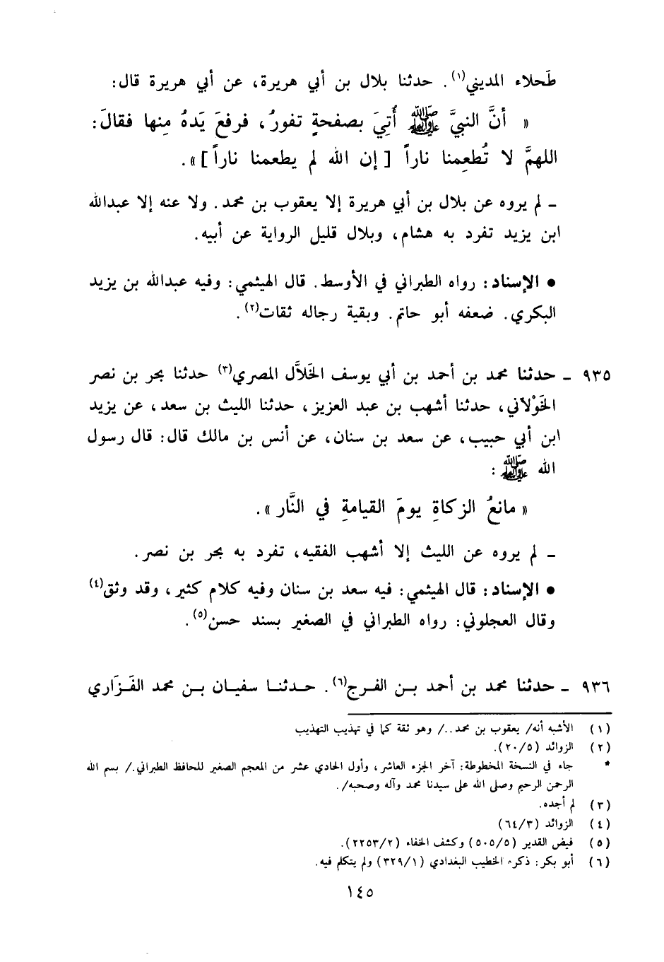 935 - حَدَّثَنَا مُحَمَّدُ بْنُ أَحْمَدَ بْنِ أَبِي يُوسُفَ الْخَلَّالُ الْمِصْرِيُّ، حَدَّثَنَا بَحْرُ بْنُ نَصْرٍ الْخَوْلَانِيُّ، حَدَّثَنَا أَشْهَبُ بْنُ عَبْدِ الْعَزِيزِ، حَدَّثَنَا اللَّيْثُ بْنُ سَعْدٍ، عَنْ يَزِيدَ بْنِ أَبِي حَبِيبٍ، عَنْ سَعْدِ بْنِ سِنَانٍ، عَنْ أَنَسِ بْنِ مَالِكٍ قَالَ: قَالَ رَسُولُ اللَّهِ صَلَّى اللَّهُ عَلَيْهِ وَآلِهِ وَسَلَّمَ: «§مَانِعُ الزَّكَاةِ يَوْمَ الْقِيَامَةِ فِي النَّارِ» لَمْ يَرْوِهِ عَنِ اللَّيْثِ إِلَّا أَشْهَبُ الْفَقِيهُ تَفَرَّدَ بِهِ بَحْرُ بْنُ نَصْرٍ