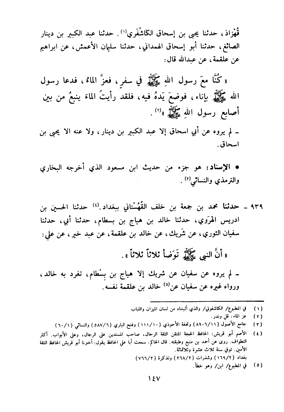 939 - حَدَّثَنَا مُحَمَّدُ بْنُ جُمُعَةَ بْنِ خَلَفٍ الْقُهُسْتَانِيُّ بِبَغْدَادَ , حَدَّثَنَا الْحُسَيْنُ بْنُ إِدْرِيسَ الْهَرَوِيُّ، حَدَّثَنَا خَالِدُ بْنُ هَيَّاجِ بْنِ بِسْطَامٍ، حَدَّثَنَا أَبِي، حَدَّثَنَا سُفْيَانُ الثَّوْرِيُّ، عَنْ شَرِيكٍ، عَنْ خَالِدِ بْنِ عَلْقَمَةَ، عَنْ عَبْدِ خَيْرٍ، عَنْ عَلِيٍّ كَرَّمَ اللَّهُ وَجْهَهُ فِي الْجَنَّةِ: أَنَّ النَّبِيَّ صَلَّى اللَّهُ عَلَيْهِ وَآلِهِ وَسَلَّمَ «§تَوَضَّأَ ثَلَاثًا ثَلَاثًا» لَمْ يَرْوِهِ عَنْ سُفْيَانَ , عَنْ شَرِيكٍ إِلَّا هَيَّاجُ بْنُ بِسْطَامٍ تَفَرَّدَ بِهِ خَالِدٌ , وَرَوَاهُ غَيْرُهُ عَنْ سُفْيَانَ , عَنْ خَالِدِ بْنِ عَلْقَمَةَ نَفْسِهِ