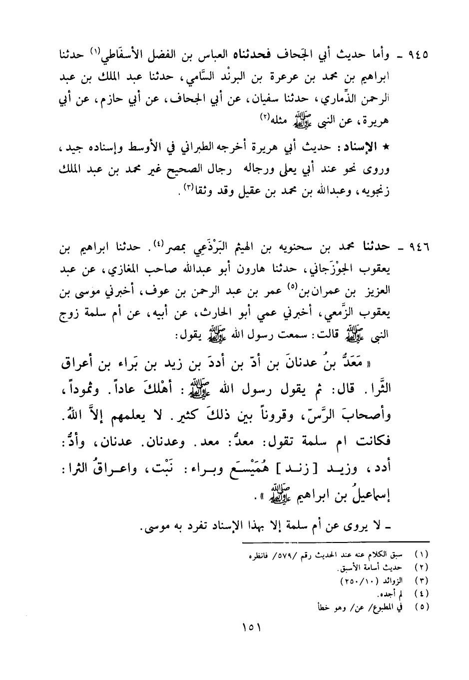 946 - حَدَّثَنَا مُحَمَّدُ بْنُ سَحْنَوَيْهِ بْنِ الْهَيْثَمِ الْبَرْذَعِيُّ، بِمِصْرَ , حَدَّثَنَا إِبْرَاهِيمُ بْنُ يَعْقُوبَ الْجُوزَجَانِيُّ، حَدَّثَنَا هَارُونُ أَبُو عَبْدِ اللَّهِ، صَاحِبُ الْمَغَازِي , عَنْ عَبْدِ الْعَزِيزِ بْنِ عِمْرَانَ، عَنْ عُمَرَ بْنِ عَبْدِ الرَّحْمَنِ بْنِ عَوْفٍ، أَخْبَرَنِي مُوسَى بْنُ يَعْقُوبَ الزَّمْعِيُّ، أَخْبَرَنِي عَمِّي أَبُو الْحَرِثِ، عَنْ أَبِيهِ، عَنْ أُمِّ سَلَمَةَ زَوْجِ النَّبِيِّ صَلَّى اللَّهُ عَلَيْهِ وَآلِهِ وَسَلَّمَ قَالَ: سَمِعْتُ رَسُولَ اللَّهِ صَلَّى اللَّهُ عَلَيْهِ وَآلِهِ وَسَلَّمَ يَقُولُ: «مَعْدُ بْنُ عَدْنَانَ بْنِ أَدِّ بْنِ أَدَدَ بْنِ زَيْدِ بْنِ بَرَاءِ بْنِ أَعْرَاقِ الثَّرَا» قَالَ: ثُمَّ يَقُولُ رَسُولُ اللَّهِ صَلَّى اللَّهُ عَلَيْهِ وَآلِهِ وَسَلَّمَ: " §أَهْلَكَ عَادًا وَثَمُودَ وَأَصْحَابَ الرَّسِّ وَقُرُونًا بَيْنَ ذَلِكَ كَثِيرًا لَا يَعْلَمُهُمْ إِلَّا اللَّهُ , فَكَانَتْ أُمُّ سَلَمَةَ تَقُولُ: مَعْدُ مَعْدُ , وعَدْنَانُ عَدْنَانُ , وَأَدَدُ أَدَدُ , وزَيْدُ بْنُ هَمِيسَعَ، وَبَرَاءُ نَبْتٌ , وَأَعْرَاقُ الثَّرَى إِسْمَاعِيلُ بْنُ إِبْرَاهِيمَ صَلَّى اللَّهُ عَلَيْهِ وَآلِهِ وَسَلَّمَ لَا يُرْوَى عَنْ أُمِّ سَلَمَةَ إِلَّا بِهَذَا الْإِسْنَادِ تَفَرَّدَ بِهِ مُوسَى