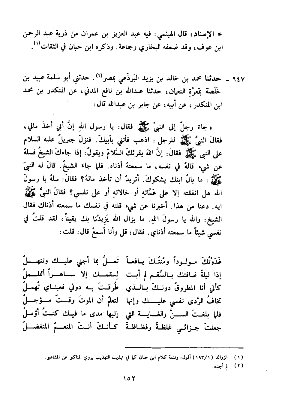947 - حَدَّثَنَا مُحَمَّدُ بْنُ خَالِدِ بْنِ يَزِيدَ الْبَرْذَعِيُّ بِمِصْرَ , حَدَّثَنِي أَبُو سَلَمَةَ عُبَيْدُ بْنُ خَلَصَةَ بِمَعْرَةِ النُّعْمَانِ , حَدَّثَنَا عَبْدُ اللَّهِ بْنُ نَافِعٍ الْمَدَنِيُّ، عَنِ الْمُنْكَدِرِ بْنِ مُحَمَّدِ بْنِ الْمُنْكَدِرِ، عَنْ أَبِيهِ، عَنْ جَابِرِ بْنِ عَبْدِ اللَّهِ قَالَ: جَاءَ رَجُلٌ إِلَى النَّبِيِّ صَلَّى اللَّهُ عَلَيْهِ وَآلِهِ وَسَلَّمَ فَقَالَ: يَا رَسُولَ اللَّهِ , إِنَّ أَبِي أَخَذَ مَالِي , فَقَالَ النَّبِيُّ صَلَّى اللَّهُ عَلَيْهِ وَآلِهِ وَسَلَّمَ لِلرَّجُلِ: " اذْهَبْ فَأْتِنِي بِأَبِيكَ , فَنَزَلَ جِبْرِيلُ عَلَيْهِ السَّلَامُ عَلَى النَّبِيِّ صَلَّى اللَّهُ عَلَيْهِ وَآلِهِ وَسَلَّمَ , فَقَالَ: إِنَّ اللَّهَ يُقْرِئُكَ السَّلَامَ , وَيَقُولُ: إِذَا جَاءَكَ الشَّيْخُ , فَسَلْهُ عَنْ شَيْءٍ قَالَهُ فِي نَفْسِهِ مَا سَمِعَتْهُ أُذُنَاهُ" , فَلَمَّا جَاءَ الشَّيْخُ قَالَ لَهُ النَّبِيُّ صَلَّى اللَّهُ عَلَيْهِ وَآلِهِ وَسَلَّمَ: «مَا بَالُ ابْنِكَ يَشْكُوكَ , أَتُرِيدُ أَنْ تَأْخُذَ مَالَهُ؟» , فَقَالَ: سَلْهُ يَا رَسُولَ اللَّهِ , هَلْ أَنْفَقْتُهُ إِلَّا عَلَى عَمَّاتِهِ أَوْ خَالَاتِهِ أَوْ عَلَى نَفْسِي" , فَقَالَ النَّبِيُّ صَلَّى اللَّهُ عَلَيْهِ وَآلِهِ وَسَلَّمَ: «إِيهِ , دَعْنَا مِنْ هَذَا أَخْبِرْنَا عَنْ شَيْءٍ قُلْتَهُ فِي نَفْسِكَ مَا سَمِعَتْهُ أُذُنَاكَ» , فَقَالَ الشَّيْخُ: وَاللَّهِ , يَا رَسُولَ اللَّهِ , مَا يَزَالُ اللَّهُ يَزِيدُنَا بِكَ يَقِينًا , لَقَدْ قُلْتُ فِي نَفْسِي شَيْئًا مَا سَمِعَتْهُ أُذُنَايَ , فَقَالَ: «قُلْ , وَأَنَا أَسْمَعُ» قَالَ: قُلْتُ: