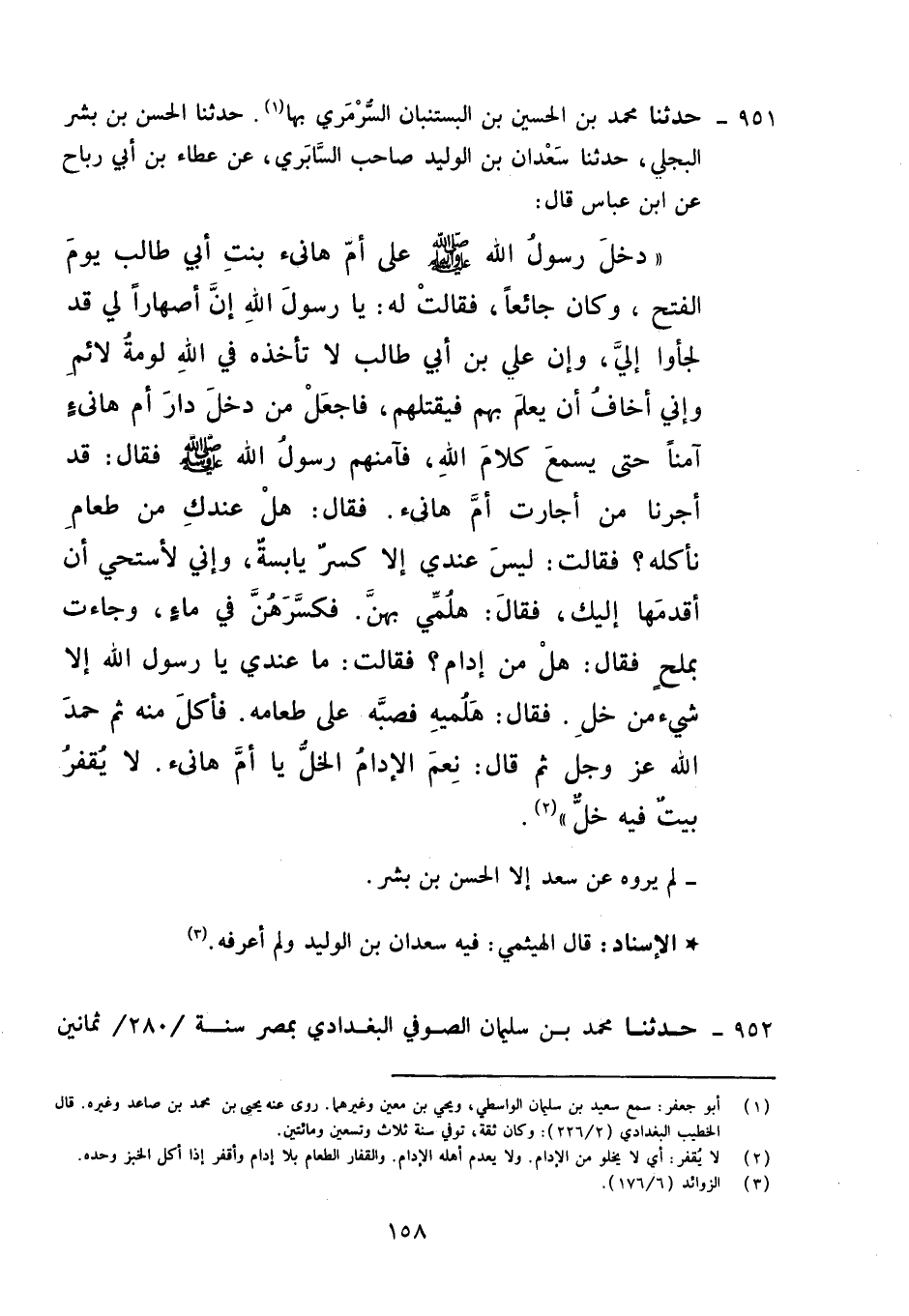 951 - حَدَّثَنَا مُحَمَّدُ بْنُ الْحُسَيْنِ الْبِسْتِنْبَانُ السَّرْمَرِيُّ بِهَا , حَدَّثَنَا الْحَسَنُ بْنُ بِشْرٍ الْبَجَلِيُّ، حَدَّثَنَا سَعْدَانُ بْنُ الْوَلِيدِ، صَاحِبُ السَّابِرِيِّ , عَنْ عَطَاءِ بْنِ أَبِي رَبَاحٍ، عَنِ ابْنِ عَبَّاسٍ قَالَ: دَخَلَ رَسُولُ اللَّهِ صَلَّى اللَّهُ عَلَيْهِ وَآلِهِ وَسَلَّمَ عَلَى أُمِّ هَانِئٍ بِنْتِ أَبِي طَالِبٍ يَوْمَ الْفَتْحِ , وَكَانَ جَائِعًا , فَقَالَتْ لَهُ: يَا رَسُولَ اللَّهِ , إِنَّ أَصْهَارًا لِي قَدْ لَجَأُوا إِلَيَّ , وَإِنَّ عَلِيَّ بْنَ أَبِي طَالِبٍ لَا تَأْخُذُهُ فِي اللَّهِ لَوْمَةُ لَائِمٍ , وَإِنِّي أَخَافُ أَنْ يَعْلَمَ بِهِمْ فَيَقْتُلَهُمْ , فَاجْعَلْ مَنْ دَخَلَ دَارَ أُمِّ هَانِئٍ آمِنًا حَتَّى يَسْمَعُوا كَلَامَ اللَّهِ , فَآمَنَهُمْ رَسُولُ اللَّهِ صَلَّى اللَّهُ عَلَيْهِ وَآلِهِ وَسَلَّمَ , فَقَالَ: «قَدْ أَجَرْنَا مَنْ أَجَارَتْ أُمُّ هَانِئٍ» , فَقَالَ: «هَلْ عِنْدَكِ مِنْ طَعَامٍ نَأْكُلُهُ؟» , فَقَالَتْ: لَيْسَ عِنْدِي إِلَّا كِسَرٌ يَابِسَةٌ , وَإِنِّي لَأَسْتَحِي أَنْ أُقَدِّمَهَا إِلَيْكَ , فَقَالَ: «هَلُمِّي بِهِنَّ» , فَكَسَّرَهُنَّ فِي مَاءٍ , وَجَاءَتْ بِمِلْحٍ , فَقَالَ: «هَلْ مِنْ إِدَامٍ؟» , فَقَالَتْ: مَا عِنْدِي يَا رَسُولَ اللَّهِ إِلَّا شَيْءٌ مِنْ خَلٍّ , فَقَالَ: «هَلُمِّيهِ» , فَصَبَّهُ عَلَى طَعَامِهِ , فَأَكَلَ مِنْهُ , ثُمَّ حَمِدَ اللَّهَ عَزَّ وَجَلَّ , ثُمَّ قَالَ: «§نِعْمَ الْإِدَامُ الْخَلُّ , يَا أُمَّ هَانِئٍ , لَا يُقْفَرُ بَيْتٌ فِيهِ خَلٌّ» لَمْ يَرْوِهِ عَنْ سَعْدَانَ إِلَّا الْحَسَنُ بْنُ بِشْرٍ