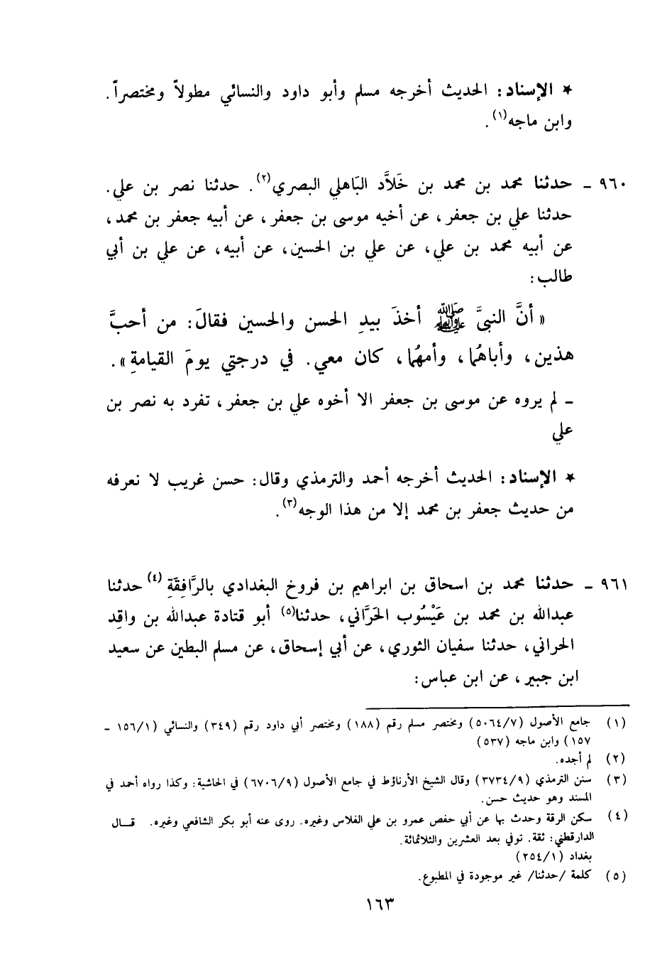 960 - حَدَّثَنَا مُحَمَّدُ بْنُ مُحَمَّدِ بْنِ خَلَّادٍ الْبَاهِلِيُّ الْبَصْرِيُّ، حَدَّثَنَا نَصْرُ بْنُ عَلِيٍّ، حَدَّثَنَا عَلِيُّ بْنُ جَعْفَرٍ، عَنْ أَخِيهِ مُوسَى بْنِ جَعْفَرٍ , عَنْ أَبِيهِ جَعْفَرِ بْنِ مُحَمَّدٍ , عَنْ أَبِيهِ مُحَمَّدِ بْنِ عَلِيٍّ , عَنْ عَلِيِّ بْنِ الْحُسَيْنِ، عَنْ أَبِيهِ، عَنْ عَلِيِّ بْنِ أَبِي طَالِبٍ كَرَّمَ اللَّهُ وَجْهَهَ فِي الْجَنَّةِ، أَنَّ النَّبِيَّ صَلَّى اللَّهُ عَلَيْهِ وَآلِهِ وَسَلَّمَ: " أَخَذَ بِيَدِ الْحَسَنِ وَالْحُسَيْنِ فَقَالَ: «§مَنْ أَحَبَّ هَذَيْنِ وَأَبَاهُمَا وَأُمَّهُمَا كَانَ مَعِي فِي دَرَجَتِي يَوْمَ الْقِيَامَةِ» لَمْ يَرْوِهِ عَنْ مُوسَى بْنِ جَعْفَرٍ إِلَّا أَخُوهُ عَلِيُّ بْنُ جَعْفَرٍ تَفَرَّدَ بِهِ نَصْرُ بْنُ عَلِيٍّ