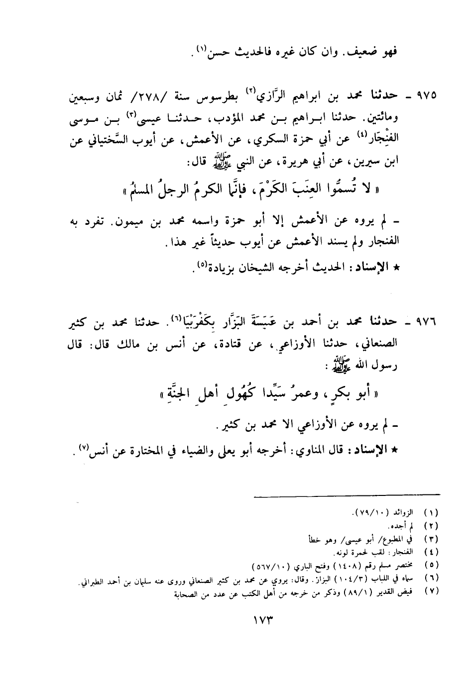 975 - حَدَّثَنَا مُحَمَّدُ بْنُ إِبْرَاهِيمَ الرَّازِيُّ، بِطَرَسُوسَ سَنَةَ 278 ثَمَانٍ وَسَبْعِينَ وَمِائَتَيْنِ , حَدَّثَنَا إِبْرَاهِيمُ بْنُ مُحَمَّدٍ الْمُؤَدِّبُ، حَدَّثَنَا أَبُو عِيسَى بْنُ مُوسَى الْغِنْجَارُ، عَنْ أَبِي حَمْزَةَ السُّكَّرِيِّ، عَنِ الْأَعْمَشِ، عَنْ أَيُّوبَ السِّخْتِيَانِيِّ، عَنِ ابْنِ سِيرِينَ، عَنْ أَبِي هُرَيْرَةَ: عَنِ النَّبِيِّ صَلَّى اللَّهُ عَلَيْهِ وَآلِهِ وَسَلَّمَ قَالَ: «§لَا تُسَمُّوا الْعِنَبَ الْكَرْمَ؛ فَإِنَّمَا الْكَرْمُ الرَّجُلُ الْمُسْلِمُ» لَمْ يَرْوِهِ عَنِ الْأَعْمَشِ إِلَّا أَبُو حَمْزَةَ، وَاسْمُهُ: مُحَمَّدُ بْنُ مَيْمُونٍ تَفَرَّدَ بِهِ الْغِنْجَارُ , وَلَمْ يُسْنِدِ الْأَعْمَشُ عَنْ أَيُّوبَ حَدِيثًا غَيْرَ هَذَا