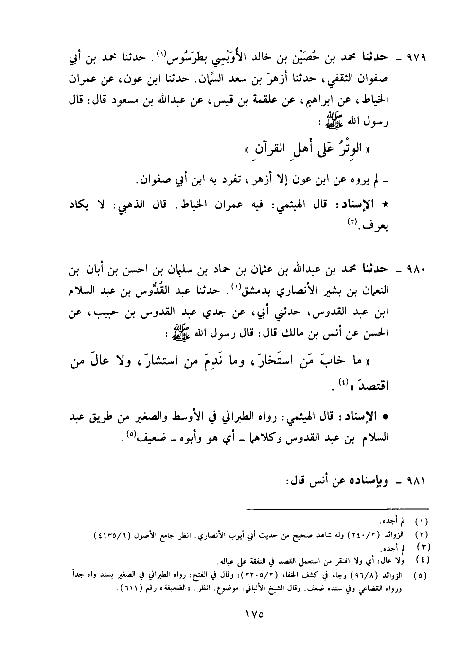 979 - حَدَّثَنَا مُحَمَّدُ بْنُ حُصَيْنِ بْنِ خَالِدٍ الْأُوَيْسِيُّ، بِطَرَسُوسَ , حَدَّثَنَا مُحَمَّدُ بْنُ أَبِي صَفْوَانَ الثَّقَفِيُّ، حَدَّثَنَا أَزْهَرُ بْنُ سَعْدٍ السَّمَّانُ، حَدَّثَنَا ابْنُ عَوْنٍ، عَنْ عِمْرَانَ الْخَيَّاطِ، عَنْ إِبْرَاهِيمَ، عَنْ عَلْقَمَةَ بْنِ قَيْسٍ، عَنْ عَبْدِ اللَّهِ بْنِ مَسْعُودٍ قَالَ: قَالَ رَسُولُ اللَّهِ صَلَّى اللَّهُ عَلَيْهِ وَآلِهِ وَسَلَّمَ: «§الْوِتْرُ عَلَى أَهْلِ الْقُرْآنِ» لَمْ يَرْوِهِ عَنِ ابْنِ عَوْنٍ إِلَّا أَزْهَرُ تَفَرَّدَ بِهِ ابْنُ أَبِي صَفْوَانَ