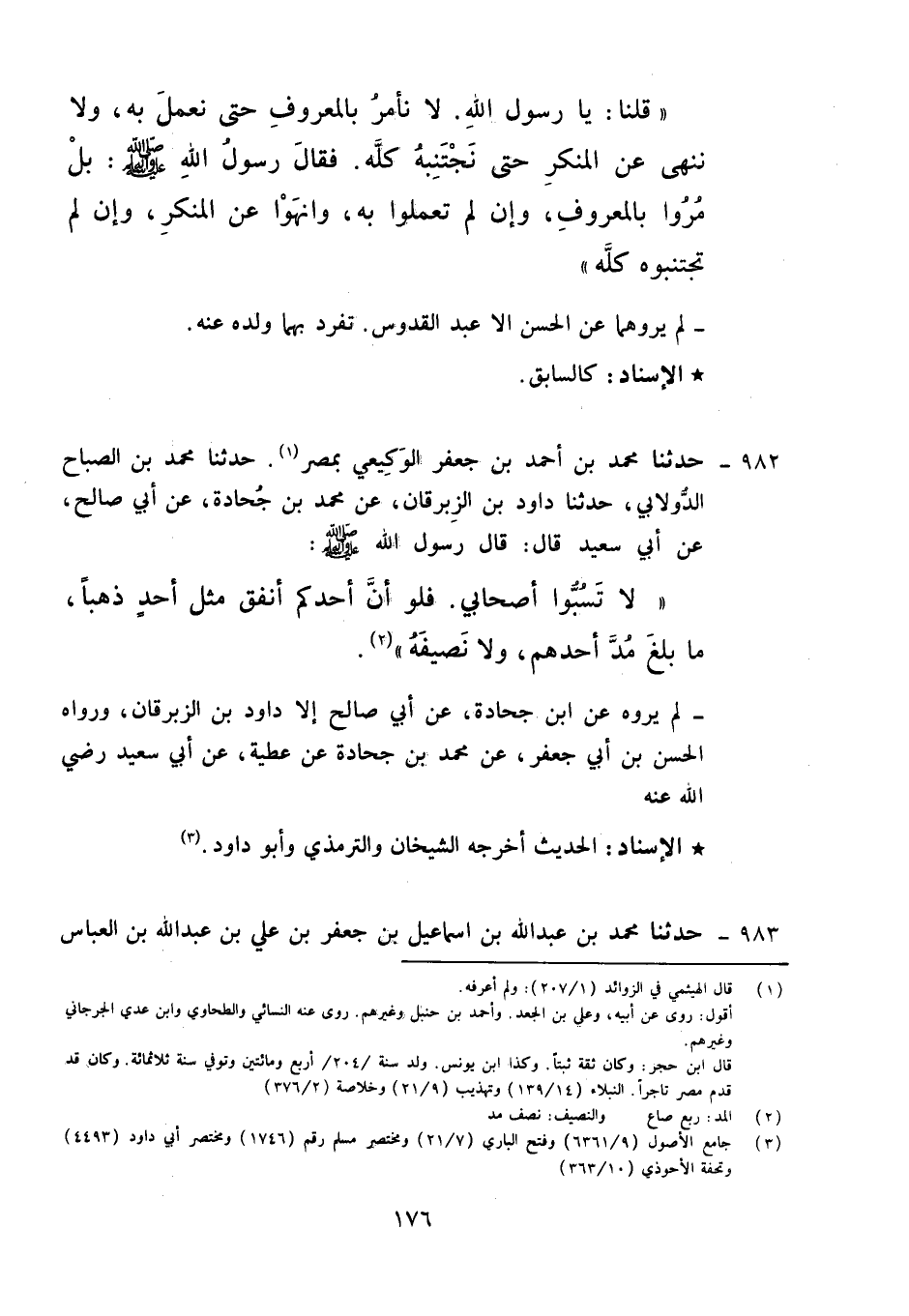 982 - حَدَّثَنَا مُحَمَّدُ بْنُ أَحْمَدَ بْنِ جَعْفَرٍ الْوَكِيعِيُّ، بِمِصْرَ , حَدَّثَنَا مُحَمَّدُ بْنُ الصَّبَاحِ الدُّولَابِيُّ، حَدَّثَنَا دَاوُدُ بْنُ الزِّبْرِقَانِ، عَنْ مُحَمَّدِ بْنِ جُحَادَةَ، عَنْ أَبِي صَالِحٍ، عَنْ أَبِي سَعِيدٍ قَالَ: قَالَ رَسُولُ اللَّهِ صَلَّى اللَّهُ عَلَيْهِ وَآلِهِ وَسَلَّمَ: «§لَا تَسُبُّوا أَصْحَابِي , فَلَوْ أَنَّ أَحَدَكُمْ أَنْفَقَ مِثْلَ أُحُدٍ ذَهَبًا مَا بَلَغَ مُدَّ أَحَدِهِمْ وَلَا نَصِيفَهُ» لَمْ يَرْوِهِ عَنِ ابْنِ جُحَادَةَ , عَنْ أَبِي صَالِحٍ إِلَّا دَاوُدُ بْنُ الزِّبْرِقَانِ. وَرَوَاهُ الْحَسَنُ بْنُ أَبِي جَعْفَرٍ , عَنْ مُحَمَّدِ بْنِ جُحَادَةَ , عَنْ عَطِيَّةَ , عَنْ أَبِي سَعِيدٍ رَضِيَ اللَّهُ عَنْهُ