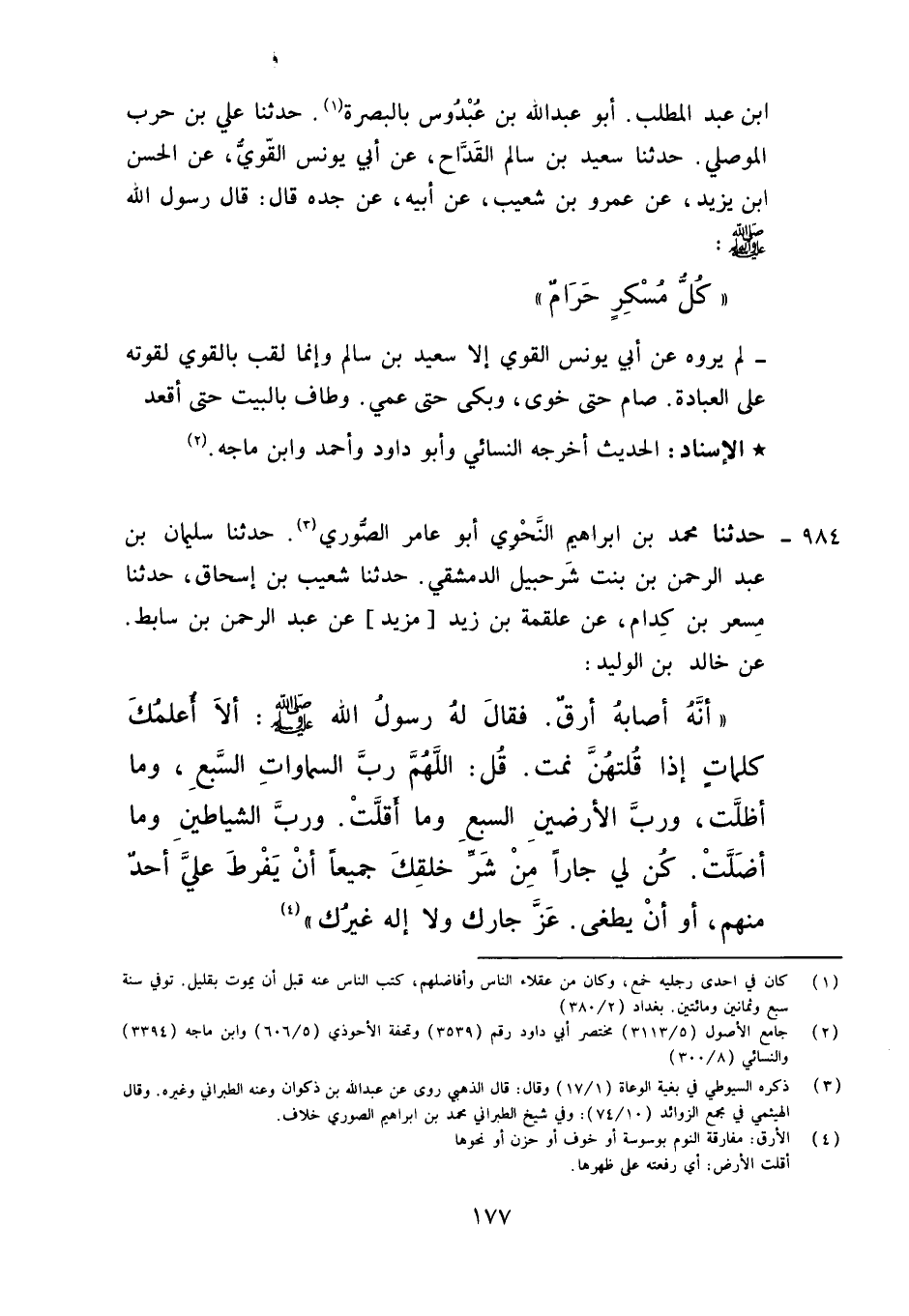 984 - حَدَّثَنَا مُحَمَّدُ بْنُ إِبْرَاهِيمَ النَّحْوِيُّ أَبُو عَامِرٍ الصُّورِيُّ، حَدَّثَنَا سُلَيْمَانُ بْنُ عَبْدِ الرَّحْمَنِ ابْنِ بِنْتِ شُرَحْبِيلَ الدِّمَشْقِيُّ، حَدَّثَنَا شُعَيْبُ بْنُ إِسْحَاقَ، حَدَّثَنَا مِسْعَرُ بْنُ كِدَامٍ، عَنْ عَلْقَمَةَ بْنِ زَيْدٍ (مَزْيَدٍ) ، عَنْ عَبْدِ الرَّحْمَنِ بْنِ سَابِطٍ، عَنْ خَالِدِ بْنِ الْوَلِيدِ، أَنَّهُ أَصَابَهُ أَرَقٌ , فَقَالَ رَسُولُ اللَّهِ صَلَّى اللَّهُ عَلَيْهِ وَآلِهِ وَسَلَّمَ: " §أَلَا أُعَلِّمُكَ كَلِمَاتٍ إِذَا قُلْتَهُنَّ نِمْتَ؟ قُلِ: اللَّهُمَّ رَبَّ السَّمَاوَاتِ السَّبْعِ وَمَا أَظَلَّتْ , وَرَبَّ الْأَرَضِينَ السَّبْعِ وَمَا أَقَلَّتْ , وَرَبَّ الشَّيَاطِينِ وَمَا أَضَلَّتْ , كُنْ لِي جَارًا مِنْ شَرِّ خَلْقِكَ جَمِيعًا؛ أَنْ يُفْرِطَ عَلَيَّ أَحَدٌ مِنْهُمْ أَوْ أَنْ يَطْغَى , عَزَّ جَارُكَ , وَلَا إِلَهَ غَيْرُكَ " لَمْ يَرْوِهِ عَنْ مِسْعَرٍ إِلَّا شُعَيْبُ بْنُ إِسْحَاقَ تَفَرَّدَ بِهِ ابْنُ بِنْتِ شُرَحْبِيلَ