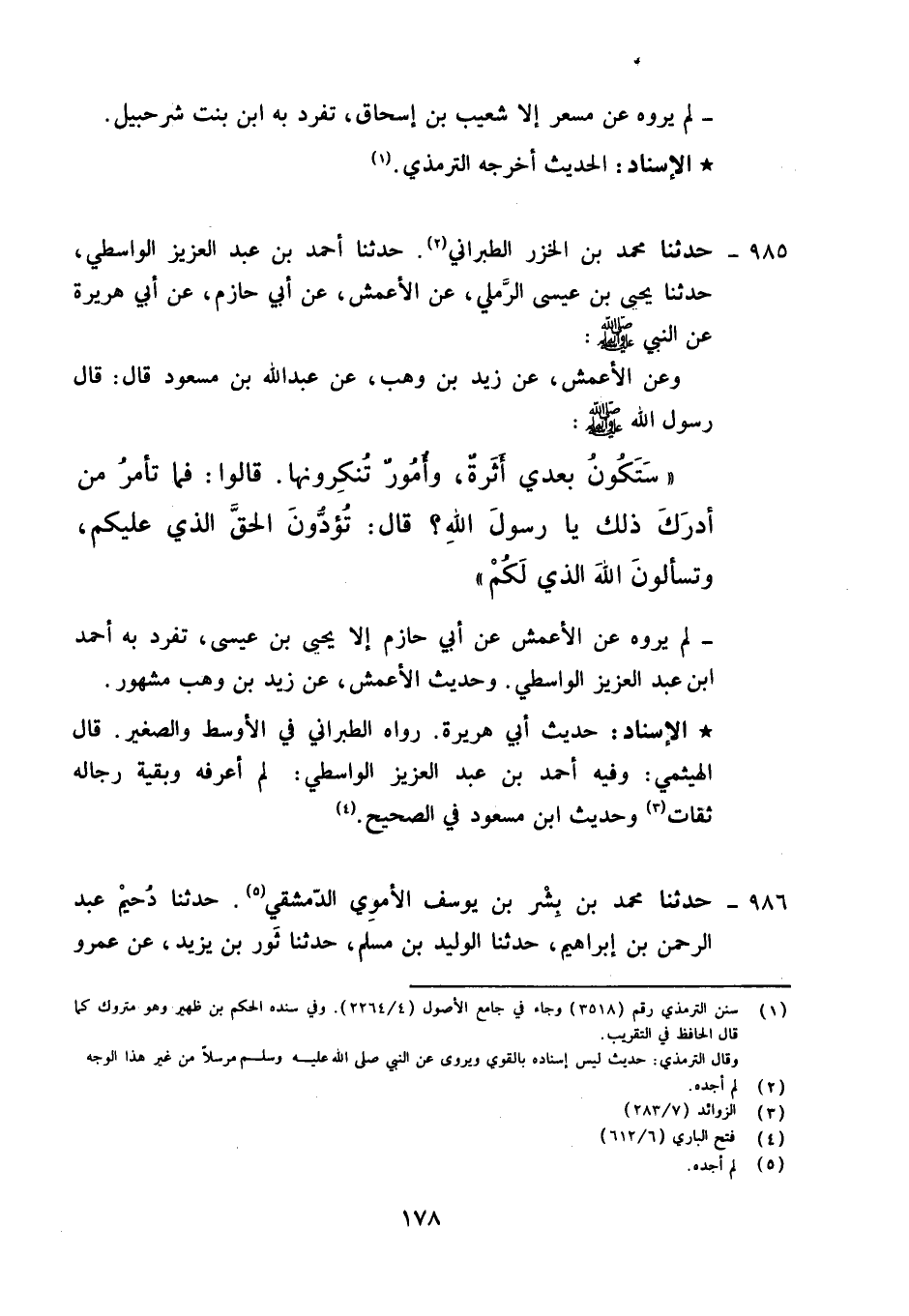 985 - حَدَّثَنَا مُحَمَّدُ بْنُ الْخَزَرِ الطَّبَرَانِيُّ، حَدَّثَنَا أَحْمَدُ بْنُ عَبْدِ الْعَزِيزِ الْوَاسِطِيُّ، حَدَّثَنَا يَحْيَى بْنُ عِيسَى الرَّمْلِيُّ، عَنِ الْأَعْمَشِ، عَنْ أَبِي حَازِمٍ، عَنْ أَبِي هُرَيْرَةَ، عَنِ النَّبِيِّ صَلَّى اللَّهُ عَلَيْهِ وَآلِهِ وَسَلَّمَ , وَعَنِ الْأَعْمَشِ، عَنْ زَيْدِ بْنِ وَهْبٍ، عَنْ عَبْدِ اللَّهِ بْنِ مَسْعُودٍ قَالَ: قَالَ رَسُولُ اللَّهِ صَلَّى اللَّهُ عَلَيْهِ وَآلِهِ وَسَلَّمَ: «§سَتَكُونُ بَعْدِي أَثَرَةٌ وَأُمُورٌ تُنْكِرُونَهَا» قَالُوا: فَمَا تَأْمُرُ مَنْ أَدْرَكَ ذَلِكَ يَا رَسُولَ اللَّهِ؟ قَالَ: «تُؤَدُّونَ الْحَقَّ الَّذِي عَلَيْكُمْ , وَتَسْأَلُونَ اللَّهَ الَّذِي لَكُمْ» لَمْ يَرْوِهِ عَنِ الْأَعْمَشِ عَنْ أَبِي حَازِمٍ إِلَّا يَحْيَى بْنُ عِيسَى تَفَرَّدَ بِهِ أَحْمَدُ بْنُ عَبْدِ الْعَزِيزِ الْوَاسِطِيُّ وَحَدِيثُ الْأَعْمَشِ , عَنْ زَيْدِ بْنِ وَهْبٍ مَشْهُورٌ