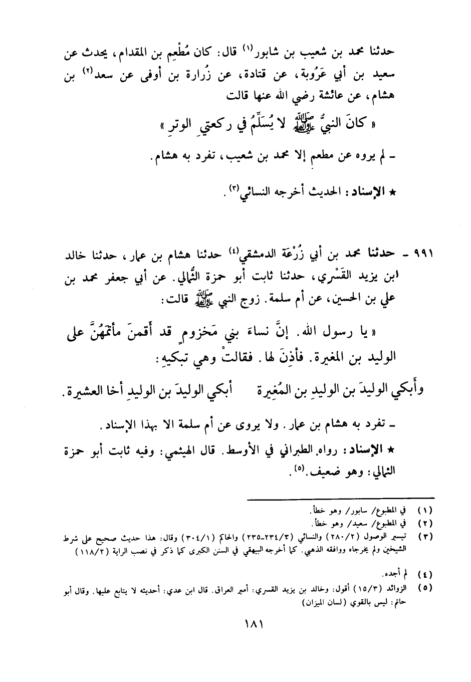 991 - حَدَّثَنَا مُحَمَّدُ بْنُ أَبِي زُرْعَةَ الدِّمَشْقِيُّ، حَدَّثَنَا هِشَامُ بْنُ عَمَّارٍ، حَدَّثَنَا خَالِدُ بْنُ يَزِيدَ الْقَسْرِيُّ، حَدَّثَنَا ثَابِتٌ أَبُو حَمْزَةَ الثُّمَالِيُّ، عَنْ أَبِي جَعْفَرٍ مُحَمَّدِ بْنِ عَلِيِّ بْنِ الْحُسَيْنِ , عَنْ أُمِّ سَلَمَةَ زَوْجِ النَّبِيِّ صَلَّى اللَّهُ عَلَيْهِ وَآلِهِ وَسَلَّمَ أَنَّهَا قَالَتْ: يَا رَسُولَ اللَّهِ , إِنَّ §نِسَاءَ بَنِي مَخْزُومٍ قَدْ أَقْمْنَ مَأْتَمَهُنَّ عَلَى الْوَلِيدِ بْنِ الْمُغِيرَةِ , فَأَذِنَ لَهَا , فَقَالَتْ وَهِيَ تَبْكِيهِ: