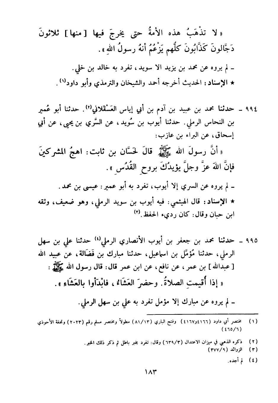994 - حَدَّثَنَا مُحَمَّدُ بْنُ عُبَيْدِ بْنِ آدَمَ بْنِ أَبِي إِيَاسٍ الْعَسْقَلَانِيُّ، حَدَّثَنَا أَبُو عُمَيْرِ بْنُ النَّحَّاسِ الرَّمْلِيُّ، حَدَّثَنَا أَيُّوبُ بْنُ سُوَيْدٍ، عَنِ السَّرِيِّ بْنِ يَحْيَى، عَنْ أَبِي إِسْحَاقَ، عَنِ الْبَرَاءِ بْنِ عَازِبٍ، أَنَّ رَسُولَ اللَّهِ صَلَّى اللَّهُ عَلَيْهِ وَآلِهِ وَسَلَّمَ قَالَ لِحَسَّانَ بْنِ ثَابِتٍ: «§اهْجُ الْمُشْرِكِينَ؛ فَإِنَّ اللَّهَ عَزَّ وَجَلَّ يُؤَيِّدُكَ بِرُوحِ الْقُدُسِ» لَمْ يَرْوِهِ عَنِ السَّرِيِّ إِلَّا أَيُّوبُ تَفَرَّدَ بِهِ أَبُو عُمَيْرٍ عِيسَى بْنُ مُحَمَّدٍ