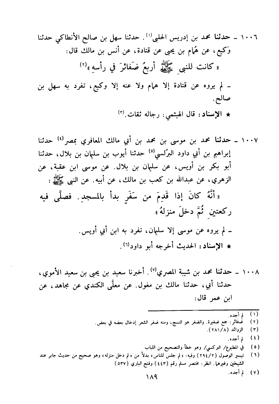 1007 - حَدَّثَنَا مُحَمَّدُ بْنُ مُوسَى بْنِ مُحَمَّدِ بْنِ أَبِي مَالِكٍ الْمَعَافِرِيُّ، بِمِصْرَ , حَدَّثَنَا إِبْرَاهِيمُ بْنُ أَبِي دَاوُدَ الْبُرُلُّسِيُّ، حَدَّثَنَا أَيُّوبُ بْنُ سُلَيْمَانَ بْنِ بِلَالٍ، حَدَّثَنَا أَبُو بَكْرِ بْنُ أَبِي أُوَيْسٍ، عَنْ سُلَيْمَانَ بْنِ بِلَالٍ، عَنْ مُوسَى بْنِ عُقْبَةَ، عَنِ الزُّهْرِيِّ، عَنْ عَبْدِ اللَّهِ بْنِ كَعْبِ بْنِ مَالِكٍ، عَنْ أَبِيهِ، عَنِ النَّبِيِّ صَلَّى اللَّهُ عَلَيْهِ وَآلِهِ وَسَلَّمَ: «أَنَّهُ كَانَ §إِذَا قَدِمَ مِنْ سَفَرٍ بَدَأَ بِالْمَسْجِدِ فَصَلَّى فِيهِ رَكْعَتَيْنِ , ثُمَّ دَخَلَ مَنْزِلَهُ» لَمْ يَرْوِهِ عَنْ مُوسَى إِلَّا سُلَيْمَانُ، تَفَرَّدَ بِهِ ابْنُ أَبِي أُوَيْسٍ