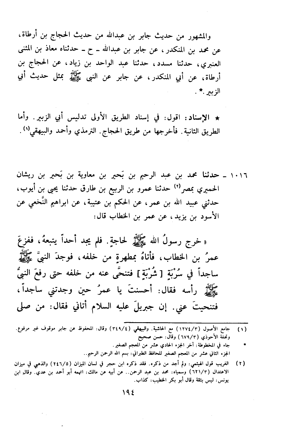 1016 - حَدَّثَنَا مُحَمَّدُ بْنُ عَبْدِ الرَّحِيمِ بْنِ بَحِيرِ بْنِ عَبْدِ اللَّهِ بْنِ مُعَاوِيَةَ بْنِ بَحِيرِ بْنِ رَيْشَانَ الْحِمْيَرِيُّ، بِمِصْرَ , حَدَّثَنَا عَمْرُو بْنُ الرَّبِيعِ بْنِ طَارِقٍ، حَدَّثَنَا يَحْيَى بْنُ أَيُّوبَ، حَدَّثَنِي عُبَيْدُ اللَّهِ بْنُ عُمَرَ، عَنِ الْحَكَمِ بْنِ عُتَيْبَةَ، عَنْ إِبْرَاهِيمَ النَّخَعِيِّ، عَنِ الْأَسْوَدِ بْنِ يَزِيدَ، عَنْ عُمَرَ بْنِ الْخَطَّابِ قَالَ: خَرَجَ رَسُولُ اللَّهِ صَلَّى اللَّهُ صَلَّى اللَّهُ عَلَيْهِ وَآلِهِ وَسَلَّمَ لِحَاجَةٍ , فَلَمْ يَجِدْ أَحَدًا يَتْبَعُهُ , فَفَزِعَ عُمَرُ بْنُ الْخَطَّابِ , فَأَتَاهُ بِمِطْهَرَةٍ مِنْ خَلْفِهِ , فَوَجَدَ النَّبِيُّ صَلَّى اللَّهُ عَلَيْهِ وَآلِهِ وَسَلَّمَ سَاجِدًا فِي سِرْبِهِ فَتَنَحَّى عَنْهُ مِنْ خَلْفِهِ حَتَّى رَفَعَ النَّبِيُّ صَلَّى اللَّهُ عَلَيْهِ وَآلِهِ وَسَلَّمَ رَأْسَهُ , فَقَالَ: " أَحْسَنْتَ يَا عُمَرُ حِينَ وَجَدْتَنِي سَاجِدًا , فَتَنَحَّيْتَ عَنِّي؛ إِنَّ جِبْرِيلَ عَلَيْهِ السَّلَامُ أَتَانِي , فَقَالَ: §مَنْ صَلَّى عَلَيْكَ مِنْ أُمَّتِكَ وَاحِدَةً صَلَّى اللَّهُ عَلَيْهِ عَشْرًا وَرَفَعَهُ بِهَا عَشْرَ دَرَجَاتٍ " لَمْ يَرْوِهِ عَنْ عُبَيْدِ اللَّهِ بْنِ عُمَرَ إِلَّا يَحْيَى بْنُ أَيُّوبَ تَفَرَّدَ بِهِ عَمْرُو بْنُ الرَّبِيعِ