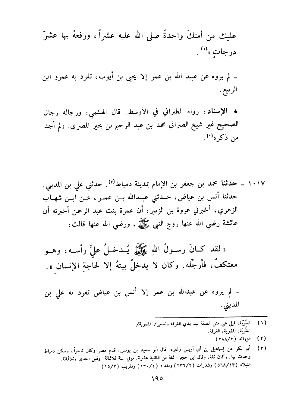 1017 - حَدَّثَنَا مُحَمَّدُ بْنُ جَعْفَرِ ابْنُ الْإِمَامِ بِمَدِينَةِ دِمْيَاطَ , حَدَّثَنِي عَلِيُّ بْنُ الْمَدِينِيِّ، حَدَّثَنَا أَنَسُ بْنُ عِيَاضٍ، حَدَّثَنِي عَبْدُ اللَّهِ بْنُ عُمَرَ، عَنِ ابْنِ شِهَابٍ الزُّهْرِيِّ، أَخْبَرَنِي عُرْوَةُ بْنُ الزُّبَيْرِ، أَنَّ عَمْرَةَ بِنْتَ عَبْدِ الرَّحْمَنِ، أَخْبَرَتْهُ أَنَّ عَائِشَةَ رَضِيَ اللَّهُ عَنْهَا زَوْجَ النَّبِيِّ صَلَّى اللَّهُ عَلَيْهِ وَآلِهِ وَسَلَّمَ وَرَضِيَ اللَّهُ عَنْهَا قَالَتْ: لَقَدْ كَانَ رَسُولُ اللَّهِ صَلَّى اللَّهُ عَلَيْهِ وَآلِهِ وَسَلَّمَ: " §يُدْخِلُ عَلَيَّ رَأْسَهُ وَهُوَ مُعْتَكِفٌ فَأُرَجِّلُهُ وَكَانَ لَا يَدْخُلُ بَيْتَهُ إِلَّا لِحَاجَةِ الْإِنْسَانِ لَمْ يَرْوِهِ عَنْ عَبْدِ اللَّهِ بْنِ عُمَرَ إِلَّا أَنَسُ بْنُ عِيَاضٍ، تَفَرَّدَ بِهِ عَلِيُّ بْنُ الْمَدِينِيِّ