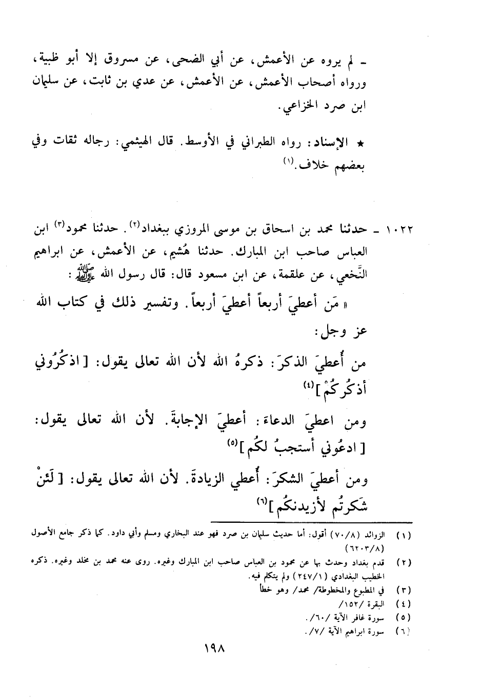 1022 - حَدَّثَنَا مُحَمَّدُ بْنُ إِسْحَاقَ بْنِ مُوسَى الْمَرْوَزِيُّ، بِبَغْدَادَ , حَدَّثَنَا مُحَمَّدُ بْنُ الْعَبَّاسِ صَاحِبُ ابْنِ الْمُبَارَكِ، حَدَّثَنَا هُشَيْمٌ، عَنِ الْأَعْمَشِ، عَنْ إِبْرَاهِيمَ النَّخَعِيِّ، عَنْ عَلْقَمَةَ، عَنِ ابْنِ مَسْعُودٍ قَالَ: قَالَ رَسُولُ اللَّهِ صَلَّى اللَّهُ عَلَيْهِ وَآلِهِ وَسَلَّمَ: " §مَنْ أَعْطَيَ أَرْبَعًا أُعْطِيَ أَرْبَعًا , وَتَفْسِيرُ ذَلِكَ فِي كِتَابِ اللَّهِ عَزَّ وَجَلَّ: مَنْ أَعْطَيَ الذِّكْرَ ذَكَرَهُ اللَّهُ؛ لِأَنَّ اللَّهَ تَعَالَى يَقُولُ: {فَاذْكُرُونِي أَذْكُرْكُمْ} [البقرة: 152] , وَمَنْ أَعْطَيَ الدُّعَاءَ أُعْطِيَ الْإِجَابَةَ؛ لِأَنَّ اللَّهَ تَعَالَى يَقُولُ: {ادْعُونِي أَسْتَجِبْ لَكُمْ} [غافر: 60] , وَمَنْ أَعْطَيَ الشُّكْرَ أُعْطِيَ الزِّيَادَةَ؛ لِأَنَّ اللَّهَ تَعَالَى يَقُولُ: {لَئِنْ شَكَرْتُمْ لَأَزِيدَنَّكُمْ} [إبراهيم: 7] , وَمَنْ أَعْطَيَ الِاسْتِغْفَارَ أُعْطِيَ الْمَغْفِرَةَ؛ لِأَنَّ اللَّهَ تَعَالَى يَقُولُ: {اسْتَغْفِرُوا رَبَّكُمْ إِنَّهُ كَانَ غَفَّارًا} [نوح: 10] لَمْ يَرْوِهِ عَنِ الْأَعْمَشِ إِلَّا هُشَيْمٌ تَفَرَّدَ بِهِ مَحْمُودُ بْنُ الْعَبَّاسِ قَالَ أَبُو الْقَاسِمِ: وَقَدِ افْتَتَنَ جَمَاعَةٌ مِمَّنْ لَا عِلْمَ لَهُمْ بِأَنْ يَقُولُوا: نَدْعُو فَلَا يُسْتَجَابُ لَنَا , وَهَذَا رَدٌّ عَلَى اللَّهِ عَزَّ وَجَلَّ؛ لِأَنَّ اللَّهَ يَقُولُ وَقَوْلُهُ الْحَقُّ {ادْعُونِي أَسْتَجِبْ لَكُمْ} [غافر: 60] , وَقَالَ: { «وَإِذَا سَأَلَكَ عِبَادِي عَنِّي فَإِنِّي قَرِيبٌ، أُجِيبُ دَعْوَةَ الدَّاعِ إِذَا دَعَانِ» } [البقرة: 186] , وَلِهَذَا مَعْنًى لَا يَعْرِفُهُ إِلَّا أَهْلُ الْعِلْمِ وَالْمَعْرِفَةِ , وَقَدْ فَسَّرَهُ النَّبِيُّ صَلَّى اللَّهُ عَلَيْهِ وَآلِهِ وَسَلَّمَ