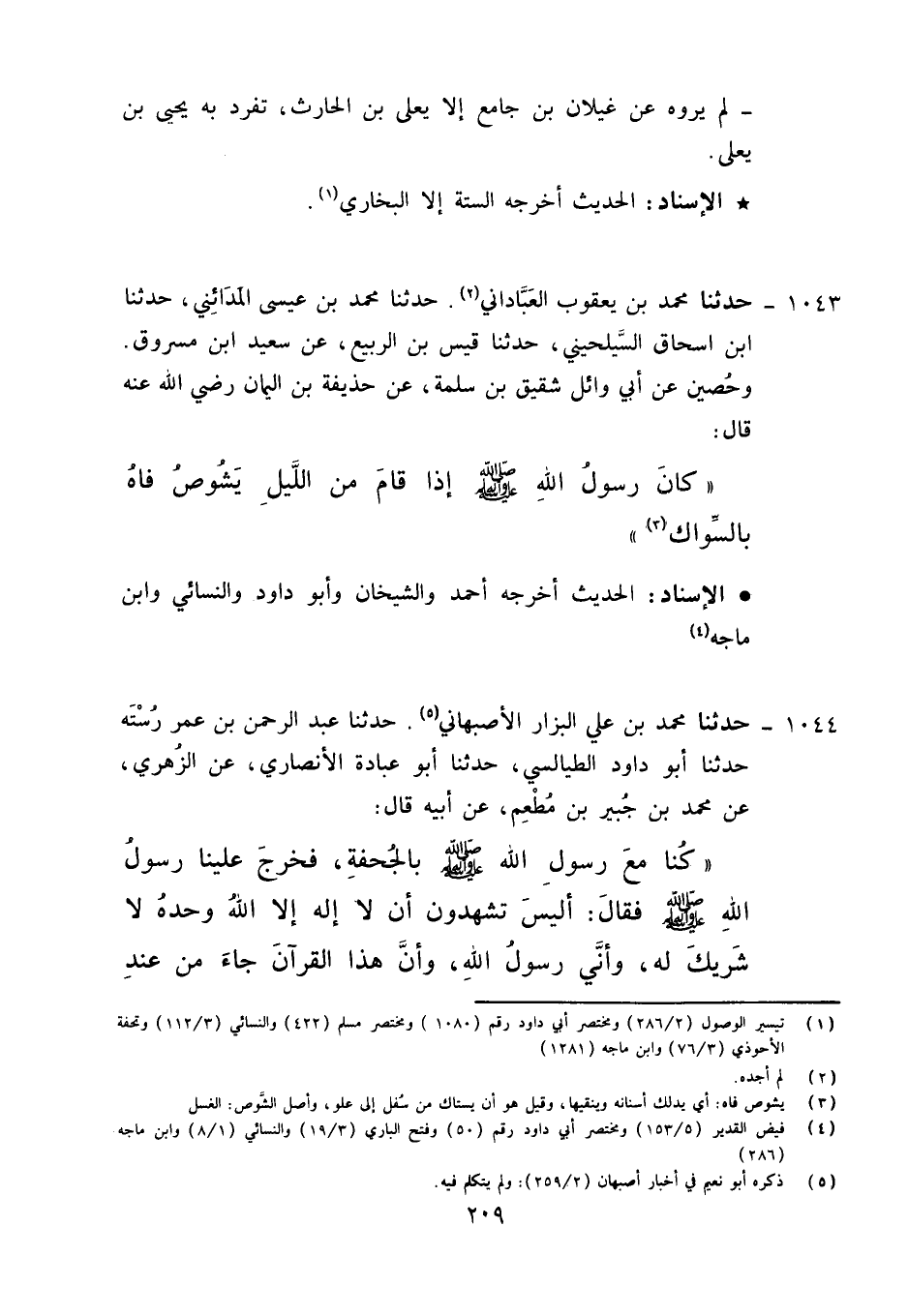1043 - حَدَّثَنَا مُحَمَّدُ بْنُ يَعْقُوبَ الْعَبَّادَانِيُّ، حَدَّثَنَا مُحَمَّدُ بْنُ عِيسَى الْمَدَائِنِيُّ، حَدَّثَنَا يَحْيَى بْنُ إِسْحَاقَ السَّيْلَحِينِيُّ، حَدَّثَنَا قَيْسُ بْنُ الرَّبِيعِ، عَنْ سَعِيدِ بْنِ مَسْرُوقٍ، وَحُصَيْنِ، عَنْ أَبِي وَائِلٍ شَقِيقِ بْنِ سَلَمَةَ , عَنْ حُذَيْفَةَ بْنِ الْيَمَانِ رَضِيَ اللَّهُ عَنْهُ قَالَ: كَانَ رَسُولُ اللَّهِ صَلَّى اللَّهُ عَلَيْهِ وَآلِهِ وَسَلَّمَ: «§إِذَا قَامَ مِنَ اللَّيْلِ يَشُوصُ فَاهُ بِالسِّوَاكِ»