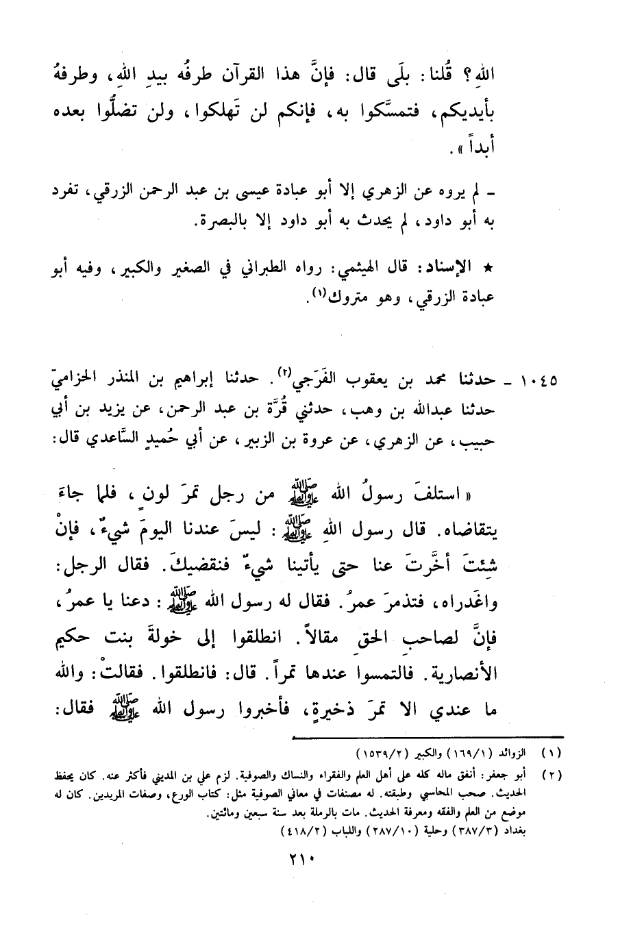 1045 - حَدَّثَنَا مُحَمَّدُ بْنُ يَعْقُوبَ الْفَرَجِيُّ الرَّمْلِيُّ، حَدَّثَنَا إِبْرَاهِيمُ بْنُ الْمُنْذِرِ الْحِزَامِيُّ، حَدَّثَنَا عَبْدُ اللَّهِ بْنُ وَهْبٍ، حَدَّثَنِي قُرَّةُ بْنُ عَبْدِ الرَّحْمَنِ، عَنْ يَزِيدَ بْنِ أَبِي حَبِيبٍ، عَنِ الزُّهْرِيِّ، عَنْ عُرْوَةَ بْنِ الزُّبَيْرِ، عَنْ أَبِي حُمَيْدٍ السَّاعِدِيِّ قَالَ: اسْتَسْلَفَ رَسُولُ اللَّهِ صَلَّى اللَّهُ عَلَيْهِ وَآلِهِ وَسَلَّمَ مِنْ رَجُلٍ تَمْرَ لَوْنٍ , فَلَمَّا جَاءَ يَتَقَاضَاهُ قَالَ رَسُولُ اللَّهِ صَلَّى اللَّهُ عَلَيْهِ وَآلِهِ وَسَلَّمَ: «لَيْسَ عِنْدَنَا الْيَوْمَ شَيْءٌ , فَإِنْ شِئْتَ أَخَّرْتَ عَنَّا حَتَّى يَأْتِيَنَا شَيْءٌ فَنُقْضِيَكَ» , فَقَالَ الرَّجُلُ: وَاغَدْرَاهْ فَتَذَمَّرَ عُمَرُ , فَقَالَ لَهُ رَسُولُ اللَّهِ صَلَّى اللَّهُ عَلَيْهِ وَآلِهِ وَسَلَّمَ: «دَعْنَا يَا عُمَرُ , فَإِنَّ §لِصَاحِبِ الْحَقِّ مَقَالًا , انْطَلِقُوا إِلَى خَوْلَةَ بِنْتِ حَكِيمٍ الْأَنْصَارِيَّةِ فَالْتَمِسُوا لَنَا عِنْدَهَا تَمْرًا» قَالَ: فَانْطَلَقُوا , فَقَالَتْ: وَاللَّهِ مَا عِنْدِي إِلَّا تَمْرُ ذَخِيرَةٍ , فَأَخْبَرُوا رَسُولَ اللَّهِ صَلَّى اللَّهُ عَلَيْهِ وَآلِهِ وَسَلَّمَ , فَقَالَ: خُذُوهُ فَاقْضُوهُ , فَلَمَّا قَضَوْهُ أَقْبَلَ إِلَى رَسُولِ اللَّهِ صَلَّى اللَّهُ عَلَيْهِ وَآلِهِ وَسَلَّمَ , فَقَالَ لَهُ: «اسْتَوْفَيْتَ؟» قَالَ: نَعَمْ , قَدْ أَوْفَيْتَ وَأَطَبْتَ , فَقَالَ رَسُولُ اللَّهِ صَلَّى اللَّهُ عَلَيْهِ وَآلِهِ وَسَلَّمَ: «إِنَّ خِيَارَ عِبَادِ اللَّهِ عِنْدَ اللَّهِ الْمُوفُونَ الْمُطَيَّبُونَ» لَمْ يَرْوِهِ عَنِ الزُّهْرِيِّ إِلَّا يَزِيدُ بْنُ أَبِي حَبِيبٍ , وَلَا عَنْ يَزِيدَ إِلَّا قُرَّةُ، تَفَرَّدَ بِهِ ابْنُ وَهْبٍ وَلَا يُرْوَى عَنْ أَبِي حُمَيْدٍ إِلَّا بِهَذَا الْإِسْنَادِ