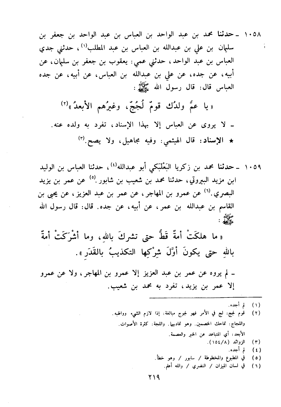 1058 - حَدَّثَنَا مُحَمَّدُ بْنُ عَبْدِ الْوَاحِدِ بْنِ الْعَبَّاسِ بْنِ عَبْدِ الْوَاحِدِ بْنِ جَعْفَرِ بْنِ سُلَيْمَانَ بْنِ عَلِيِّ بْنِ عَبْدِ اللَّهِ بْنِ الْعَبَّاسِ بْنِ عَبْدِ الْمُطَّلِبِ، حَدَّثَنِي جَدِّي الْعَبَّاسُ بْنُ عَبْدِ الْوَاحِدِ، حَدَّثَنِي عَمِّي يَعْقُوبُ بْنُ جَعْفَرِ بْنِ سُلَيْمَانَ، عَنْ أَبِيهِ، عَنْ جَدِّهِ، عَنْ عَلِيِّ بْنِ عَبْدِ اللَّهِ بْنِ الْعَبَّاسِ، عَنْ أَبِيهِ، عَنْ جَدِّهِ الْعَبَّاسِ قَالَ: قَالَ رَسُولُ اللَّهِ صَلَّى اللَّهُ عَلَيْهِ وَآلِهِ وَسَلَّمَ: «يَا عَمِّ , §وَلَدُكَ قَوْمٌ لَجَجٌ , وَغَيْرُهُمُ الْأَبْعَدُ» لَا يُرْوَى عَنِ الْعَبَّاسِ إِلَّا بِهَذَا الْإِسْنَادِ تَفَرَّدَ بِهِ وَلَدُهُ عَنْهُ