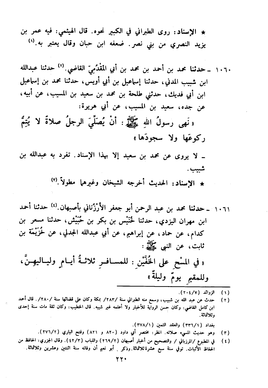 1061 - حَدَّثَنَا مُحَمَّدُ بْنُ عَبْدِ الرَّحْمَنِ أَبُو جَعْفَرٍ الْمَرْزُبَانِيُّ، بأَصْبَهَانَ , حَدَّثَنَا أَحْمَدُ بْنُ مِهْرَانَ الْيَزْدِيُّ، حَدَّثَنَا خُنَيْسُ بْنُ بَكْرِ بْنِ خُنَيْسٍ، حَدَّثَنَا مِسْعَرُ بْنُ كِدَامٍ، عَنْ حَمَّادٍ، عَنْ إِبْرَاهِيمَ، عَنْ أَبِي عَبْدِ اللَّهِ الْجَدَلِيِّ، عَنْ خُزَيْمَةَ بْنِ ثَابِتٍ، عَنِ النَّبِيِّ صَلَّى اللَّهُ عَلَيْهِ وَآلِهِ وَسَلَّمَ: «فِي الْمَسْحِ عَلَى الْخُفَّيْنِ §لِلْمُسَافِرِ ثَلَاثَةُ أَيَّامٍ وَلَيَالِيهِنَّ , وَلِلْمُقِيمِ يَوْمٌ وَلَيْلَةٌ» لَمْ يَرْوِهِ عَنْ مِسْعَرٍ إِلَّا خُنَيْسُ بْنُ بَكْرٍ