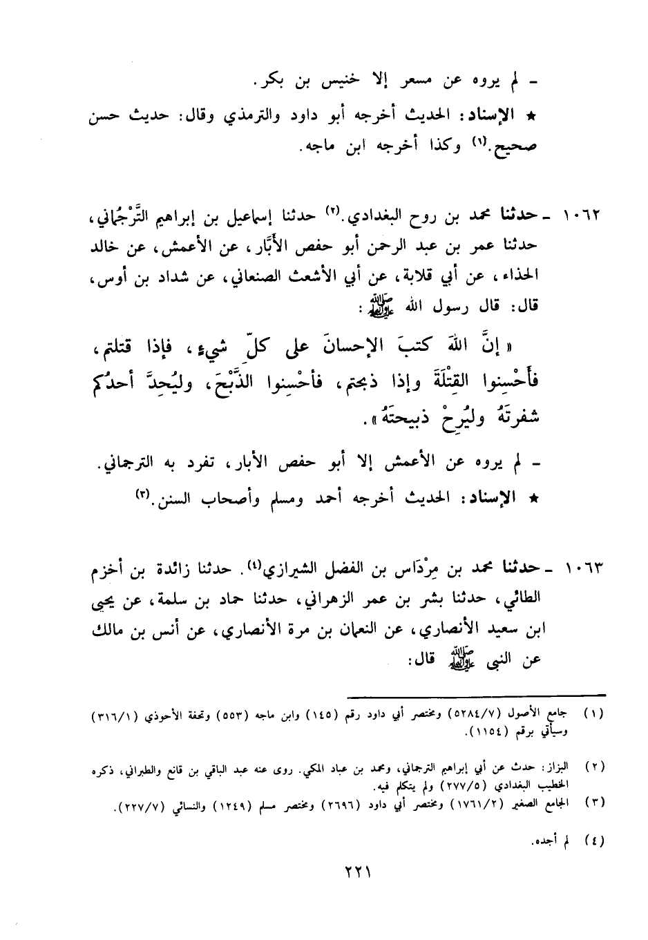 1062 - حَدَّثَنَا مُحَمَّدُ بْنُ رَوْحٍ الْبَغْدَادِيُّ، حَدَّثَنَا إِسْمَاعِيلُ بْنُ إِبْرَاهِيمَ التَّرْجُمَانِيُّ، حَدَّثَنَا عُمَرُ بْنُ عَبْدِ الرَّحْمَنِ أَبُو حَفْصٍ الْأَبَّارُ، عَنِ الْأَعْمَشِ، عَنْ خَالِدٍ الْحَذَّاءِ، عَنْ أَبِي قِلَابَةَ، عَنْ أَبِي الْأَشْعَثِ الصَّنْعَانِيِّ، عَنْ شَدَّادِ بْنِ أَوْسٍ قَالَ: قَالَ رَسُولُ اللَّهِ صَلَّى اللَّهُ عَلَيْهِ وَآلِهِ وَسَلَّمَ: «إِنَّ اللَّهَ §كَتَبَ الْإِحْسَانَ عَلَى كُلِّ شَيْءٍ , فَإِذَا قَتَلْتُمْ فَأَحْسِنُوا الْقِتْلَةَ , وَإِذَا ذَبَحْتُمْ فَأَحْسِنُوا الذَّبْحَ , وَلْيُحِدَّ أَحَدُكُمْ شَفْرَتَهُ , وَلْيُرِحْ ذَبِيحَتَهُ» لَمْ يَرْوِهِ عَنِ الْأَعْمَشِ إِلَّا أَبُو حَفْصٍ الْأَبَّارِ، تَفَرَّدَ بِهِ التَّرْجُمَانِيُّ