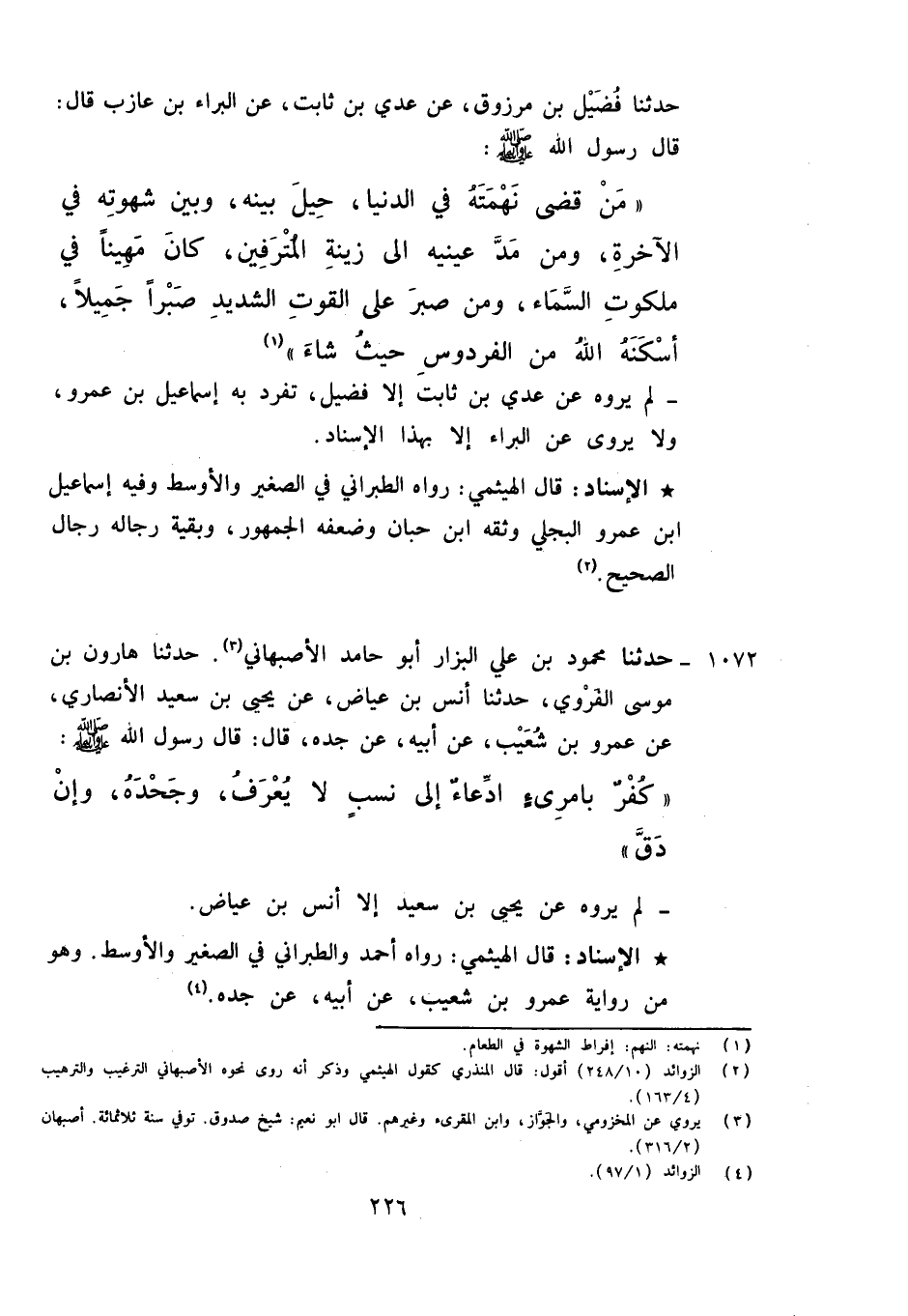 1072 - حَدَّثَنَا مَحْمُودُ بْنُ عَلِيٍّ الْبَزَّارُ أَبُو حَامِدٍ الْأَصْبَهَانِيُّ، حَدَّثَنَا هَارُونُ بْنُ مُوسَى الْقَرَوِيُّ، حَدَّثَنَا أَنَسُ بْنُ عِيَاضٍ، عَنْ يَحْيَى بْنِ سَعِيدٍ الْأَنْصَارِيِّ، عَنْ عَمْرِو بْنِ شُعَيْبٍ، عَنْ أَبِيهِ، عَنْ جَدِّهِ قَالَ: قَالَ رَسُولُ اللَّهِ صَلَّى اللَّهُ عَلَيْهِ وَآلِهِ وَسَلَّمَ: «§كُفْرٌ بامْرِئٍ ادِّعَاءٌ إِلَى نَسَبٍ لَا يُعْرَفُ , وَجَحْدُهُ وَإِنْ دَقَّ» لَمْ يَرْوِهِ عَنْ يَحْيَى بْنِ سَعِيدٍ إِلَّا أَنَسُ بْنُ عِيَاضٍ