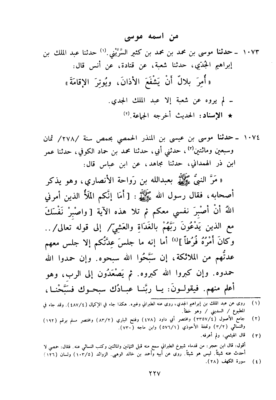 1074 - حَدَّثَنَا مُوسَى بْنُ عِيسَى بْنِ الْمُنْذِرِ الْحِمْصِيُّ، بِحِمْصَ سَنَةَ 278 ثَمَانٍ وَسَبْعِينَ وَمِائَتَيْنِ , حَدَّثَنِي أَبِي، حَدَّثَنَا مُحَمَّدُ بْنُ حَمَّادٍ الْكُوفِيُّ، حَدَّثَنَا عُمَرُ بْنُ ذَرٍّ الْهَمْدَانِيُّ، حَدَّثَنَا مُجَاهِدٌ، عَنِ ابْنِ عَبَّاسٍ قَالَ: مَرَّ النَّبِيُّ صَلَّى اللَّهُ عَلَيْهِ وَآلِهِ وَسَلَّمَ بِعَبْدِ اللَّهِ بْنِ رَوَاحَةَ الْأَنْصَارِيِّ وَهُوَ يُذَكِّرُ أَصْحَابَهُ , فَقَالَ رَسُولُ اللَّهِ صَلَّى اللَّهُ عَلَيْهِ وَآلِهِ وَسَلَّمَ: «§أَمَا إِنَّكُمُ الْمَلَأُ الَّذِينَ أَمَرَنِي اللَّهُ أَنْ أَصْبِرَ نَفْسِي مَعَكُمْ» , ثُمَّ تَلَا هَذِهِ الْآيَةَ {وَاصْبِرْ نَفْسَكَ مَعَ الَّذِينَ يَدْعُونَ رَبَّهُمْ بِالْغَدَاةِ وَالْعَشِيِّ} [الكهف: 28] إِلَى قَوْلِهِ: {وَكَانَ أَمْرُهُ فُرُطًا} [الكهف: 28] أَمَا إِنَّهُ مَا جَلَسَ عِدَّتُكُمْ إِلَّا جَلَسَ مَعَهُمْ عِدَّتُهُمْ مِنَ الْمَلَائِكَةِ إِنْ سَبَّحُوا اللَّهَ سَبَّحُوهُ , وَإِنْ حَمِدُوا اللَّهَ حَمِدُوهُ , وَإِنْ كَبَّرُوا اللَّهَ كَبَّرُوهُ , ثُمَّ يَصْعَدُونَ إِلَى الرَّبِّ وَهُوَ أَعْلَمُ مِنْهُمْ , فَيَقُولُونَ: يَا رَبَّنَا , عِبَادُكَ سَبَّحُوكَ فَسَبَّحْنَا , وَكَبَّرُوكَ فَكَبَّرْنَا , وَحَمِدُوكَ فَحِمَدْنَا , فَيَقُولُ رَبُّنَا: يَا مَلَائِكَتِي أُشْهِدُكُمْ أَنِّي قَدْ غَفَرْتُ لَهُمْ , فَيَقُولُونَ: فِيهِمْ فُلَانٌ وَفُلَانٌ الْخَطَّاءُ فَيَقُولُ: هُمُ الْقَوْمُ لَا يَشْقَى بِهِمْ جَلِيسُهُمْ " لَمْ يَرْوِهِ عَنْ عُمَرَ بْنِ ذَرٍّ إِلَّا مُحَمَّدُ بْنُ حَمَّادٍ، تَفَرَّدَ بِهِ عِيسَى بْنُ الْمُنْذِرِ , وَلَا يُرْوَى عَنِ ابْنِ عَبَّاسٍ إِلَّا بِهَذَا الْإِسْنَادِ