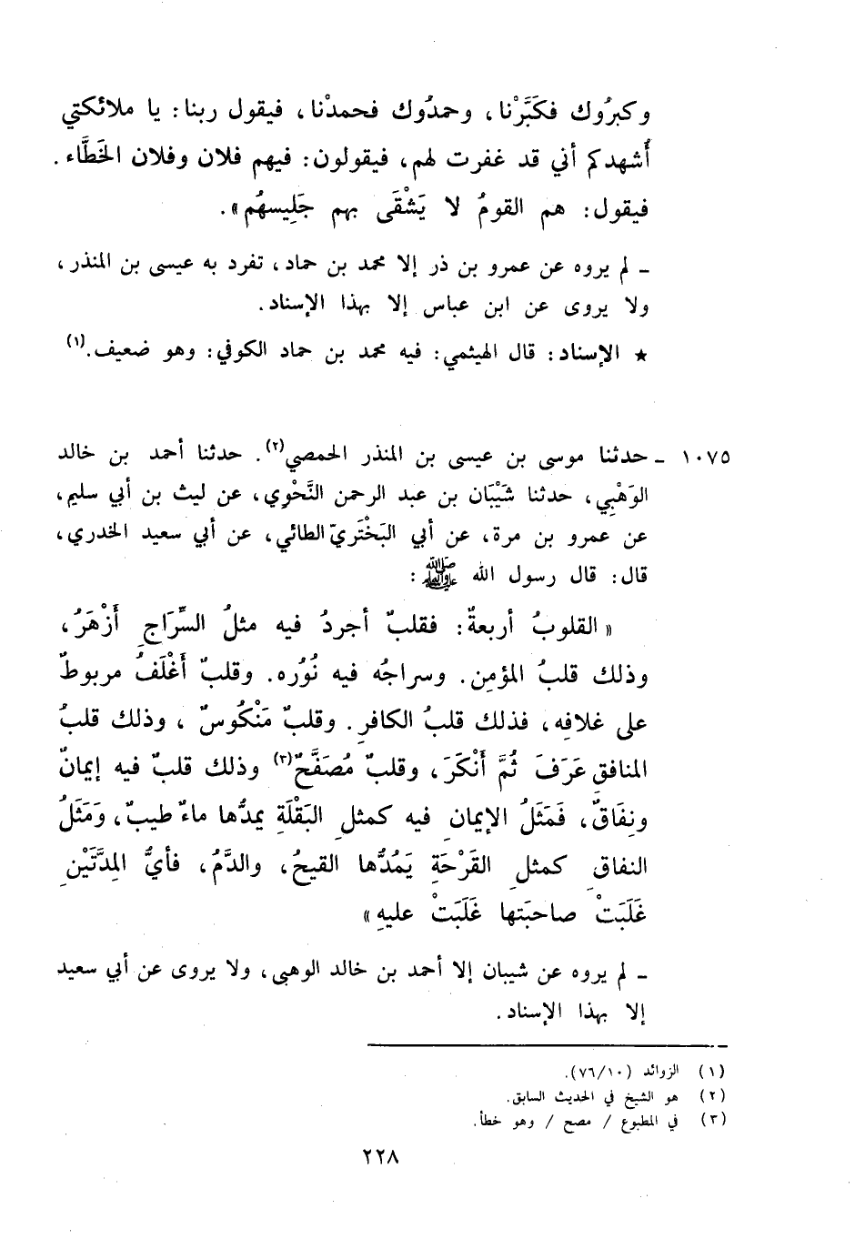 1075 - حَدَّثَنَا مُوسَى بْنُ عِيسَى بْنِ الْمُنْذِرِ الْحِمْصِيُّ، حَدَّثَنَا أَحْمَدُ بْنُ خَالِدٍ الْوَهْبِيُّ، حَدَّثَنَا شَيْبَانُ بْنُ عَبْدِ الرَّحْمَنِ النَّحْوِيُّ، عَنْ لَيْثِ بْنِ أَبِي سُلَيْمٍ، عَنْ عَمْرِو بْنِ مُرَّةَ، عَنْ أَبِي الْبَخْتَرِيِّ الطَّائِيِّ، عَنْ أَبِي سَعِيدٍ الْخُدْرِيِّ قَالَ: قَالَ رَسُولُ اللَّهِ صَلَّى اللَّهُ عَلَيْهِ وَآلِهِ وَسَلَّمَ: " §الْقُلُوبُ أَرْبَعَةٌ: فَقَلَبٌ أَجْرَدُ فِيهِ مِثْلُ السِّرَاجِ أَزْهَرُ وَذَلِكَ قَلْبُ الْمُؤْمِنِ وَسِرَاجُهُ فِيهِ نُورُهُ , وَقَلَبٌ أَغْلَفُ مَرْبُوطٌ عَلَى غِلَافِهِ فَذَلِكَ قَلْبُ الْكَافِرِ , وَقَلَبٌ مَنْكُوسٌ وَذَلِكَ قَلْبُ الْمُنَافِقِ عَرَفَ ثُمَّ أَنْكَرَ , وَقَلَبٌ مُصِحٌّ , وَذَلِكَ قَلْبٌ فِيهِ إِيمَانٌ وَنِفَاقٌ , فَمَثَلُ الْإِيمَانِ فِيهِ كَمَثَلِ الْبَقْلَةِ يَمُدُّهَا مَاءٌ طَيِّبٌ , وَمَثَلُ النِّفَاقِ كَمَثَلِ الْقُرْحَةِ يَمُدُّهَا الْقَيْحُ وَالدَّمُ , فَأَيُّ الْمَدَّتَيْنِ غَلَبَتْ عَلَى صَاحِبَتِهَا غَلَبَتْ عَلَيْهِ " لَمْ يَرْوِهِ عَنْ شَيْبَانَ إِلَّا أَحْمَدُ بْنُ خَالِدٍ الْوَهْبِيُّ , وَلَا يُرْوَى عَنْ أَبِي سَعِيدٍ إِلَّا بِهَذَا الْإِسْنَادِ