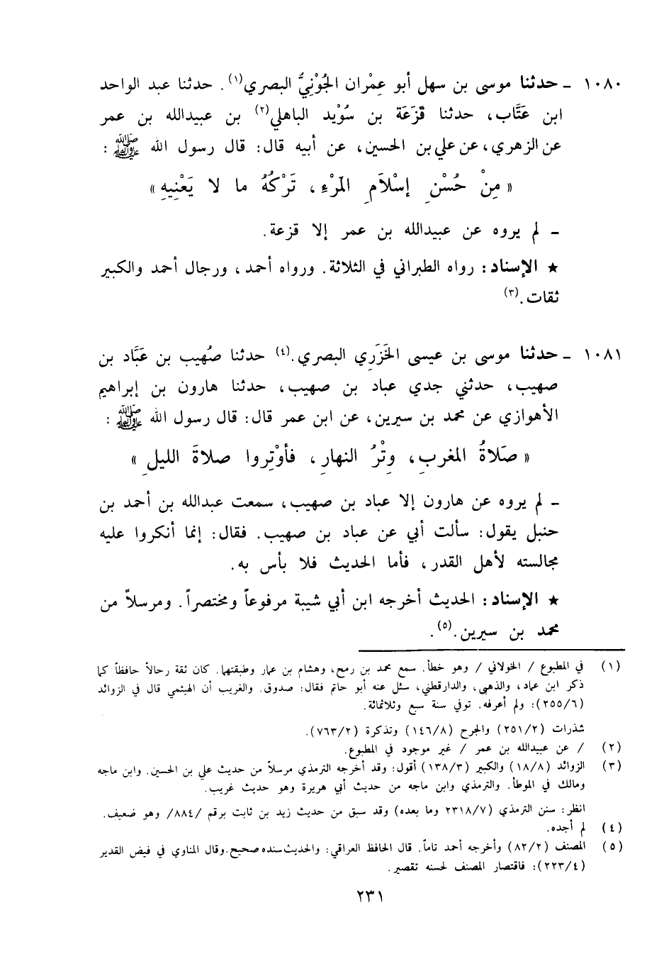 1080 - حَدَّثَنَا مُوسَى بْنُ سَهْلٍ أَبُو عِمْرَانَ الْجَوْنِيُّ الْبَصْرِيُّ، حَدَّثَنَا عَبْدُ الْوَاحِدِ بْنُ غَيَّاثٍ، حَدَّثَنَا قَزَعَةُ بْنُ سُوَيْدٍ الْبَاهِلِيُّ عَنِ الزُّهْرِيِّ، عَنْ عَلِيِّ بْنِ الْحُسَيْنِ، عَنْ أَبِيهِ قَالَ: قَالَ رَسُولُ اللَّهِ صَلَّى اللَّهُ عَلَيْهِ وَآلِهِ وَسَلَّمَ: «§مِنْ حُسْنِ إِسْلَامِ الْمَرْءِ تَرْكُهُ مَا لَا يَعْنِيهِ» لَمْ يَرْوِهِ عَنْ عَبْدِ اللَّهِ بْنِ عُمَرَ إِلَّا قَزَعَةُ