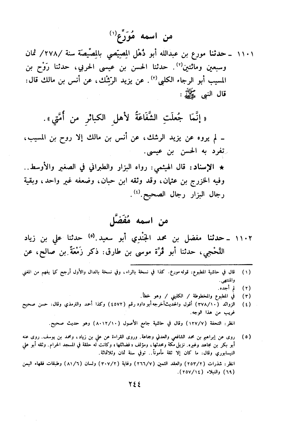 1101 - حَدَّثَنَا مُوَرِّعُ بْنُ عَبْدِ اللَّهِ أَبُو ذُهْلٍ الْمِصِّيصِيُّ، بِالْمِصِّيصَةِ سَنَةَ 278 ثَمَانٍ وَسَبْعِينَ وَمِائَتَيْنِ , حَدَّثَنَا الْحَسَنُ بْنُ عِيسَى الْحَرْبِيُّ، حَدَّثَنَا رَوْحُ بْنُ الْمُسَيَّبِ أَبُو رَجَاءٍ الْكَلِينِيُّ , عَنْ يَزِيدَ الرِّشْكِ، عَنْ أَنَسِ بْنِ مَالِكٍ قَالَ: قَالَ النَّبِيُّ صَلَّى اللَّهُ عَلَيْهِ وَآلِهِ وَسَلَّمَ: «§إِنَّمَا جُعِلَتِ الشَّفَاعَةُ لِأَهْلِ الْكَبَائِرِ مِنْ أُمَّتِي» لَمْ يَرْوِهِ عَنْ يَزِيدَ الرِّشْكِ عَنْ أَنَسِ بْنِ مَالِكٍ إِلَّا رَوْحُ بْنُ الْمُسَيَّبِ تَفَرَّدَ بِهِ الْحَسَنُ بْنُ عِيسَى