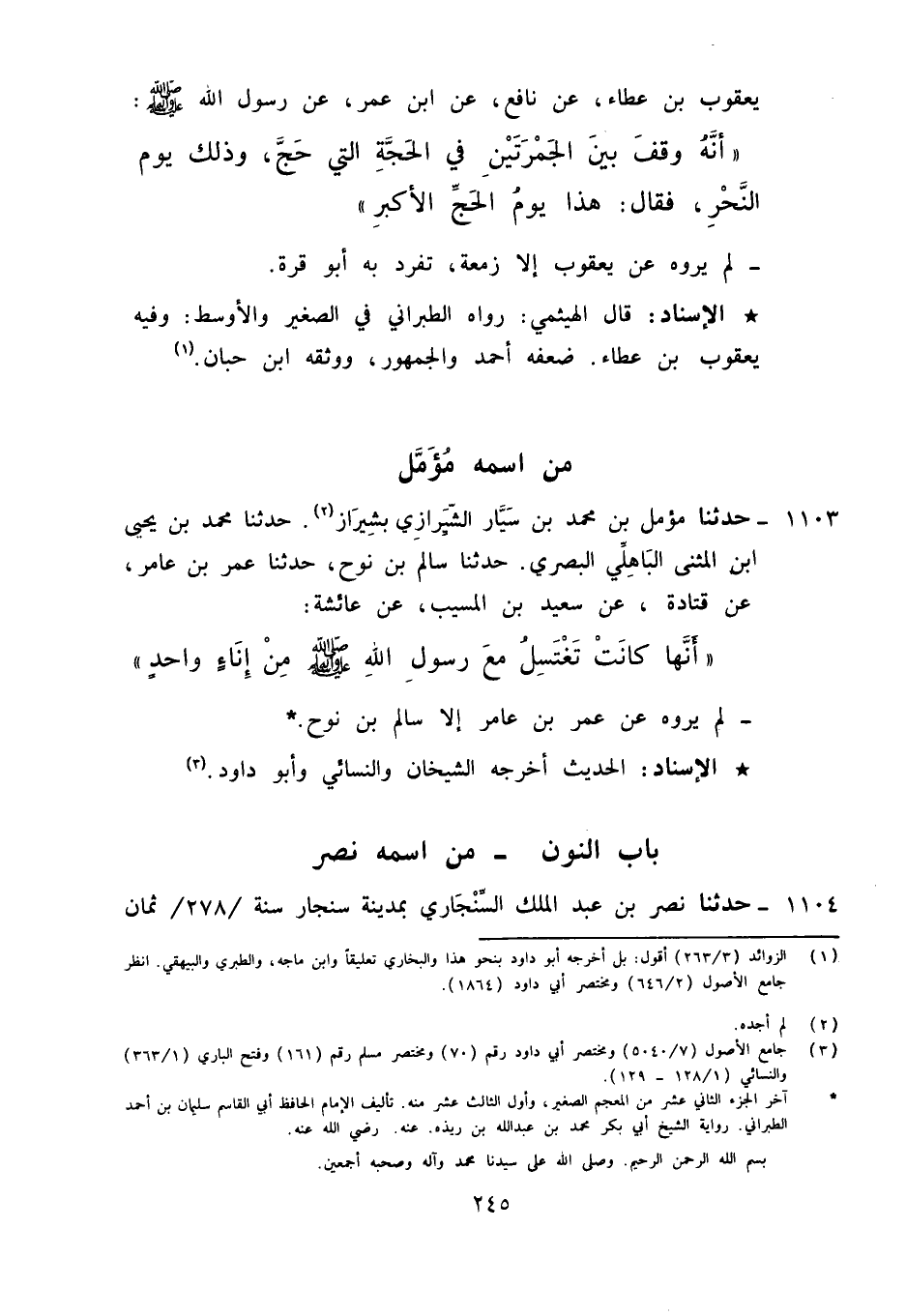 1104 - حَدَّثَنَا نَصْرُ بْنُ عَبْدِ الْمَلِكِ السِّنْجَارِيُّ، بِمَدِينَةِ سِنْجَارَ سَنَةَ 278 ثَمَانٍ وَسَبْعِينَ وَمِائَتَيْنِ , حَدَّثَنَا مَعْمَرُ بْنُ مُحَمَّدِ بْنِ عُبَيْدِ اللَّهِ بْنِ أَبِي رَافِعٍ صَاحِبُ النَّبِيِّ صَلَّى اللَّهُ عَلَيْهِ وَآلِهِ وَسَلَّمَ , حَدَّثَنَا أَبِي مُحَمَّدٍ , عَنْ أَبِيهِ عُبَيْدِ اللَّهِ , عَنْ أَبِيهِ أَبِي رَافِعٍ قَالَ: قَالَ رَسُولُ اللَّهِ صَلَّى اللَّهُ عَلَيْهِ وَآلِهِ وَسَلَّمَ: «§إِذَا طَنَّتْ أُذُنُ أَحَدِكُمْ فَلْيَذْكُرْنِي وَلْيُصَلِّ عَلَيَّ» لَا يُرْوَى عَنْ أَبِي رَافِعٍ إِلَّا بِهَذَا الْإِسْنَادِ تَفَرَّدَ بِهِ مَعْمَرُ بْنُ مُحَمَّدٍ