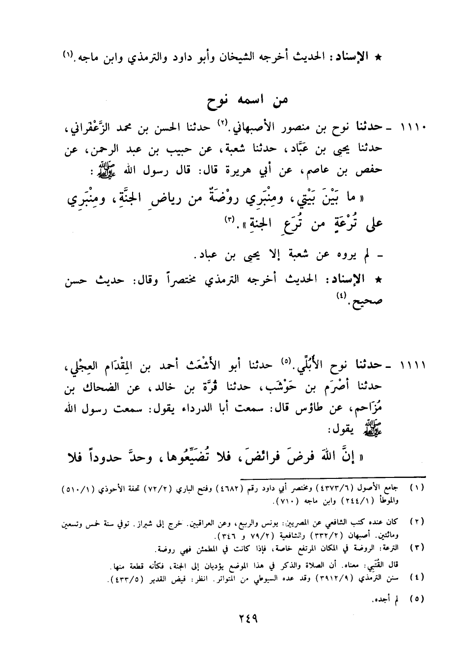 1110 - حَدَّثَنَا نُوحُ بْنُ مَنْصُورٍ الْأَصْبَهَانِيُّ، حَدَّثَنَا الْحَسَنُ بْنُ مُحَمَّدٍ الزَّعْفَرَانِيُّ، حَدَّثَنَا يَحْيَى بْنُ عَبَّادٍ، حَدَّثَنَا شُعْبَةُ، عَنْ حَبِيبِ بْنِ عَبْدِ الرَّحْمَنِ، عَنْ حَفْصِ بْنِ عَاصِمٍ، عَنْ أَبِي هُرَيْرَةَ قَالَ: قَالَ رَسُولُ اللَّهِ صَلَّى اللَّهُ عَلَيْهِ وَآلِهِ وَسَلَّمَ: «§مَا بَيْنَ بَيْتِي وَمِنْبَرِي رَوْضَةٌ مِنْ رِيَاضِ الْجَنَّةِ , وَمِنْبَرِي عَلَى تُرْعَةٍ مِنْ تُرَعِ الْجَنَّةِ» لَمْ يَرْوِهِ عَنْ شُعْبَةَ إِلَّا يَحْيَى بْنُ عَبَّادٍ