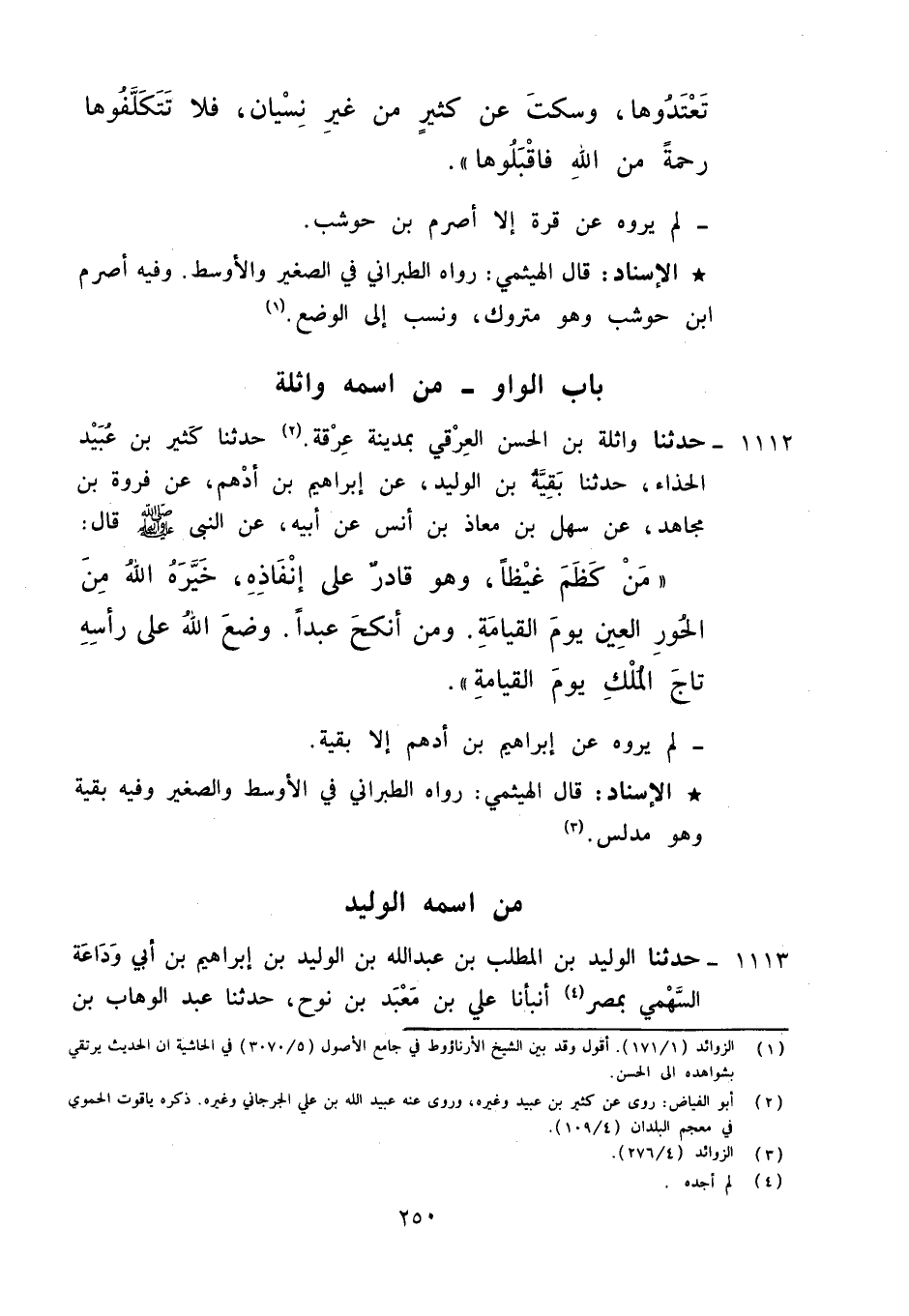 1112 - حَدَّثَنَا وَاثِلَةُ بْنُ الْحَسَنِ الْعُرُقِيُّ، بِمَدِينَةِ عُرُقَةَ , حَدَّثَنَا كَثِيرُ بْنُ عُبَيْدٍ الْحَذَّاءُ، حَدَّثَنَا بَقِيَّةُ بْنُ الْوَلِيدِ، عَنْ إِبْرَاهِيمَ بْنِ أَدْهَمَ، عَنْ فَرْوَةَ بْنِ مُجَاهِدٍ، عَنْ سَهْلِ بْنِ مُعَاذِ بْنِ أَنَسٍ، عَنْ أَبِيهِ، عَنِ النَّبِيِّ صَلَّى اللَّهُ عَلَيْهِ وَآلِهِ وَسَلَّمَ قَالَ: «§مَنْ كَظَمَ غَيْظًا وَهُوَ قَادِرٌ عَلَى إِنْفَاذِهِ خَيَّرَهُ اللَّهُ مِنَ الْحُورِ الْعِينِ يَوْمَ الْقِيَامَةِ , وَمَنْ أَنْكَحَ عَبْدًا وَضَعَ اللَّهُ عَلَى رَأْسِهِ تَاجَ الْمُلْكِ يَوْمَ الْقِيَامَةِ» لَمْ يَرْوِهِ عَنْ إِبْرَاهِيمَ بْنِ أَدْهَمَ إِلَّا بَقِيَّةُ