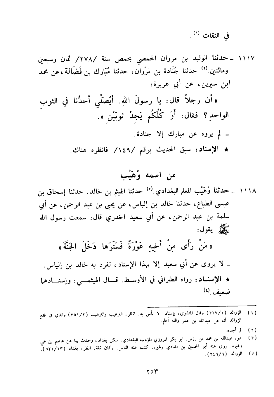 1118 - حَدَّثَنَا وُهَيْبٌ الْمُعَلِّمُ الْبَغْدَادِيُّ، حَدَّثَنَا الْهَيْثَمُ بْنُ خَالِدٍ، حَدَّثَنَا إِسْحَاقُ بْنُ عِيسَى الطَّبَّاعُ، حَدَّثَنَا خَالِدُ بْنُ إِلْيَاسَ، عَنْ يَحْيَى بْنِ عَبْدِ الرَّحْمَنِ، عَنْ أَبِي سَلَمَةَ بْنِ عَبْدِ الرَّحْمَنِ، عَنْ أَبِي سَعِيدٍ الْخُدْرِيِّ قَالَ: سَمِعْتُ رَسُولَ اللَّهِ صَلَّى اللَّهُ عَلَيْهِ وَآلِهِ وَسَلَّمَ يَقُولُ: «§مَنْ رَأَى مِنْ أَخِيهِ عَوْرَةً فَسَتَرَهَا عَلَيْهِ دَخَلَ الْجَنَّةَ» لَا يُرْوَى عَنْ أَبِي سَعِيدٍ إِلَّا بِهَذَا الْإِسْنَادِ تَفَرَّدَ بِهِ خَالِدُ بْنُ إِلْيَاسَ