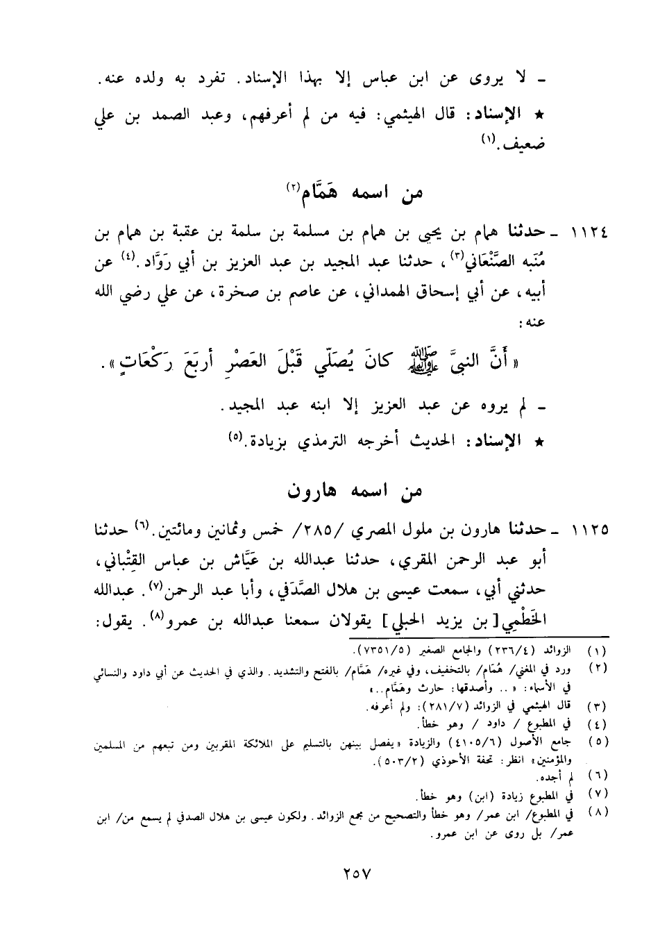1124 - حَدَّثَنَا هَمَّامُ بْنُ يَحْيَى بْنِ هَمَّامِ بْنِ مَسْلَمَةَ بْنِ سَلَمَةَ بْنِ عُقْبَةَ بْنِ هَمَّامِ بْنِ مُنَبِّهٍ الصَّنْعَانِيُّ، حَدَّثَنَا عَبْدُ الْمَجِيدِ بْنُ عَبْدِ الْعَزِيزِ بْنِ أَبِي رَوَّادٍ، عَنْ أَبِيهِ، عَنْ أَبِي إِسْحَاقَ الْهَمْدَانِيِّ، عَنْ عَاصِمِ بْنِ ضَمْرَةَ، عَنْ عَلِيٍّ كَرَّمَ اللَّهُ وَجْهَهُ فِي الْجَنَّةِ أَنَّ النَّبِيَّ صَلَّى اللَّهُ عَلَيْهِ وَآلِهِ وَسَلَّمَ " كَانَ §يُصَلِّي قَبْلَ الْعَصْرِ أَرْبَعَ رَكَعَاتٍ لَمْ يَرْوِهِ عَنْ عَبْدِ الْعَزِيزِ إِلَّا ابْنُهُ عَبْدُ الْمَجِيدِ