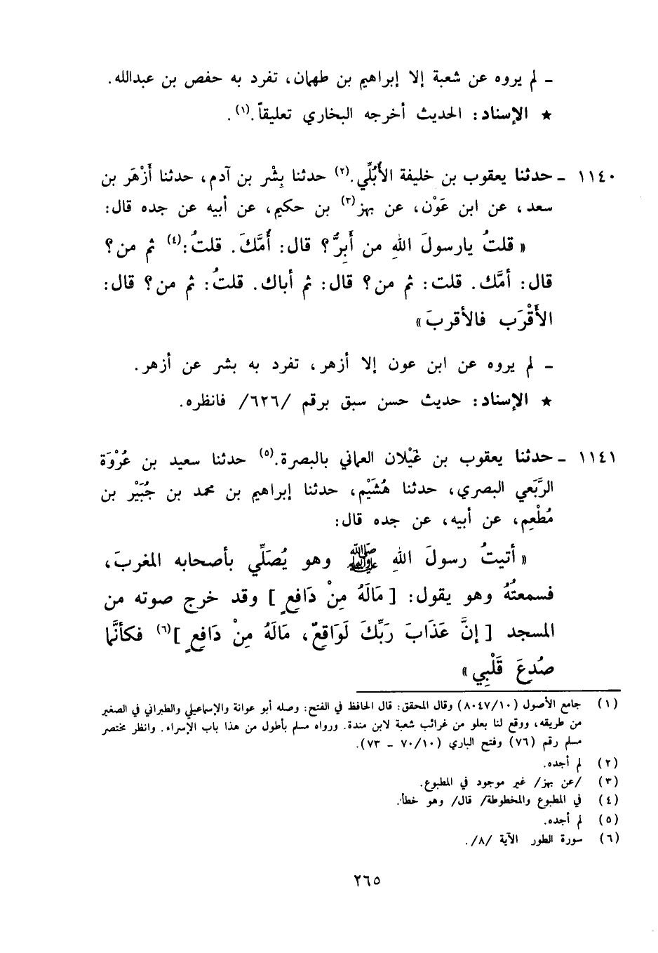 1141 - حَدَّثَنَا يَعْقُوبُ بْنُ غَيْلَانَ الْعُمَانِيُّ، بِالْبَصْرَةِ , حَدَّثَنَا سَعِيدُ بْنُ عُرْوَةَ الرَّبَعِيُّ الْبَصْرِيُّ، حَدَّثَنَا هُشَيْمٌ، حَدَّثَنَا إِبْرَاهِيمُ بْنُ مُحَمَّدِ بْنِ جُبَيْرِ بْنِ مُطْعِمٍ، عَنْ أَبِيهِ، عَنْ جَدِّهِ قَالَ: أَتَيْتُ رَسُولَ اللَّهِ صَلَّى اللَّهُ عَلَيْهِ وَآلِهِ وَسَلَّمَ وَهُوَ يُصَلِّي بِأَصْحَابِهِ الْمَغْرِبَ , فَسَمِعْتُهُ وَهُوَ يَقُولُ: {§مَا لَهُ مِنْ دَافِعٍ} [الطور: 8] , وَقَدْ خَرَجَ صَوْتُهُ مِنَ الْمَسْجِدِ {إِنَّ عَذَابَ رَبِّكَ لَوَاقِعٌ مَا لَهُ مِنْ دَافِعٍ} [الطور: 8] , فَكَأَنَّمَا صُدِعَ قَلْبِي لَمْ يَرْوِهِ عَنْ إِبْرَاهِيمَ بْنِ مُحَمَّدٍ إِلَّا هُشَيْمٌ تَفَرَّدَ بِهِ سَعِيدُ بْنُ عُرْوَةَ وَهُوَ ثِقَةٌ , وَلَا نَحْفَظُ لِإِبْرَاهِيمَ بْنِ مُحَمَّدِ بْنِ جُبَيْرٍ حَدِيثًا مُسْنَدًا غَيْرَ هَذَا
