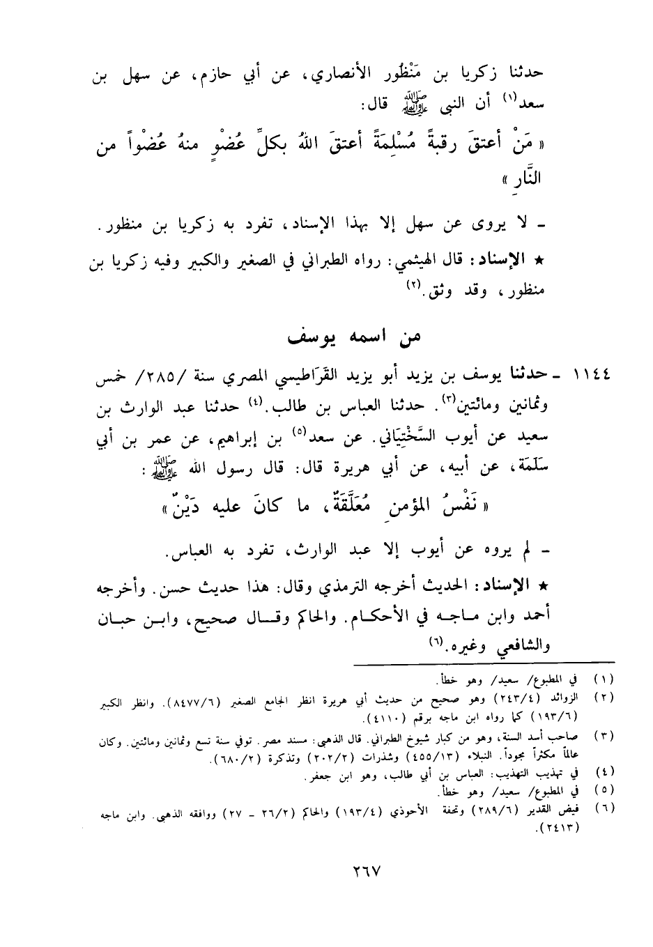1144 - حَدَّثَنَا يُوسُفُ بْنُ يَزِيدَ أَبُو يَزِيدَ الْقَرَاطِيسِيُّ الْمِصْرِيُّ، سَنَةَ 285 خَمْسٍ وَثَمَانِينَ وَمِائَتَيْنِ , حَدَّثَنَا الْعَبَّاسُ بْنُ طَالِبٍ، حَدَّثَنَا عَبْدُ الْوَارِثِ بْنُ سَعِيدٍ، عَنْ أَيُّوبَ السِّخْتِيَانِيِّ، عَنْ سَعِيدِ بْنِ إِبْرَاهِيمَ، عَنْ عُمَرَ بْنِ أَبِي سَلَمَةَ، عَنْ أَبِيهِ، عَنْ أَبِي هُرَيْرَةَ قَالَ: قَالَ رَسُولُ اللَّهِ صَلَّى اللَّهُ عَلَيْهِ وَآلِهِ وَسَلَّمَ: «§نَفْسُ الْمُؤْمِنِ مُعَلَّقَةٌ مَا كَانَ عَلَيْهِ دَيْنٌ» لَمْ يَرْوِهِ عَنْ أَيُّوبَ إِلَّا عَبْدُ الْوَارِثِ، تَفَرَّدَ بِهِ الْعَبَّاسُ