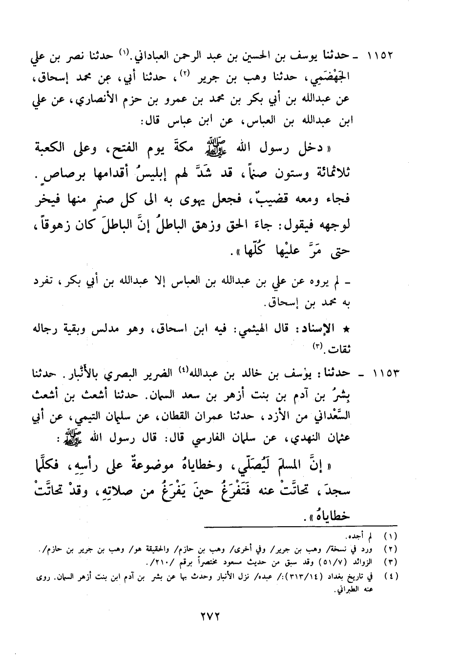 1152 - حَدَّثَنَا يُوسُفُ بْنُ الْحُسَيْنِ بْنِ عَبْدِ الرَّحْمَنِ الْعَبَّادَانِيُّ، حَدَّثَنَا نَصْرُ بْنُ عَلِيٍّ الْجَهْضَمِيُّ، حَدَّثَنَا وَهْبُ بْنُ جَرِيرٍ، حَدَّثَنَا أَبِي، عَنْ مُحَمَّدِ بْنِ إِسْحَاقَ , عَنْ عَبْدِ اللَّهِ بْنِ أَبِي بَكْرِ بْنِ مُحَمَّدِ بْنِ عَمْرِو بْنِ حَزْمٍ الْأَنْصَارِيِّ، عَنْ عَلِيِّ بْنِ عَبْدِ اللَّهِ بْنِ الْعَبَّاسِ، عَنِ ابْنِ عَبَّاسٍ، قَالَ: دَخَلَ رَسُولُ اللَّهِ صَلَّى اللَّهُ عَلَيْهِ وَآلِهِ وَسَلَّمَ مَكَّةَ يَوْمَ الْفَتْحِ وَعَلَى الْكَعْبَةِ ثَلَاثَةُ مِائَةٍ وَسِتُّونَ صَنَمًا قَدْ شَدَّ لَهُمْ إِبْلِيسُ أَقْدَامَهَا بِرَصَاصٍ , فَجَاءَ وَمَعَهُ قَضِيبٌ , فَجَعَلَ يَهْوِي بِهِ إِلَى كُلِّ صَنَمٍ مِنْهَا فَيَخِرُّ لِوَجْهِهِ , فَيَقُولُ: " {§جَاءَ الْحَقُّ وَزَهَقَ الْبَاطِلُ , إِنَّ الْبَاطِلَ كَانَ زَهُوقًا} [الإسراء: 81] حَتَّى مَرَّ عَلَيْهَا كُلِّهَا " لَمْ يَرْوِهِ عَنْ عَلِيِّ بْنِ عَبْدِ اللَّهِ بْنِ الْعَبَّاسِ إِلَّا عَبْدُ اللَّهِ بْنُ أَبِي بَكْرٍ، تَفَرَّدَ بِهِ مُحَمَّدُ بْنُ إِسْحَاقَ