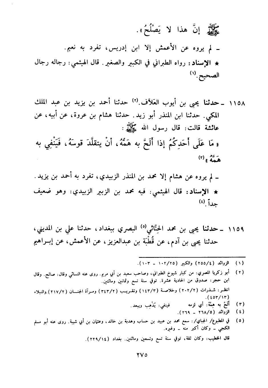 1158 - حَدَّثَنَا يَحْيَى بْنُ أَيُّوبَ الْعَلَّافُ، حَدَّثَنَا أَحْمَدُ بْنُ يَزِيدَ بْنِ عَبْدِ الْمَلِكِ الْمَكِّيُّ، حَدَّثَنَا ابْنُ الْمُنْذِرِ أَبُو زَيْدٍ، حَدَّثَنَا هِشَامُ بْنُ عُرْوَةَ، عَنْ أَبِيهِ، عَنْ عَائِشَةَ قَالَتْ: قَالَ رَسُولُ اللَّهِ صَلَّى اللَّهُ عَلَيْهِ وَآلِهِ وَسَلَّمَ: «§مَا عَلَى أَحَدِكُمْ إِذَا أَلَحَّ بِهِ هَمُّهُ أَنْ يَتَقَّلدَ قَوْسَهُ , فَيَنْفِي بِهِ هَمَّهُ» لَمْ يَرْوِهِ عَنْ هِشَامٍ إِلَّا مُحَمَّدُ بْنُ الْمُنْذِرِ الزُّبَيْدِيُّ تَفَرَّدَ بِهِ أَحْمَدُ بْنُ يَزِيدَ