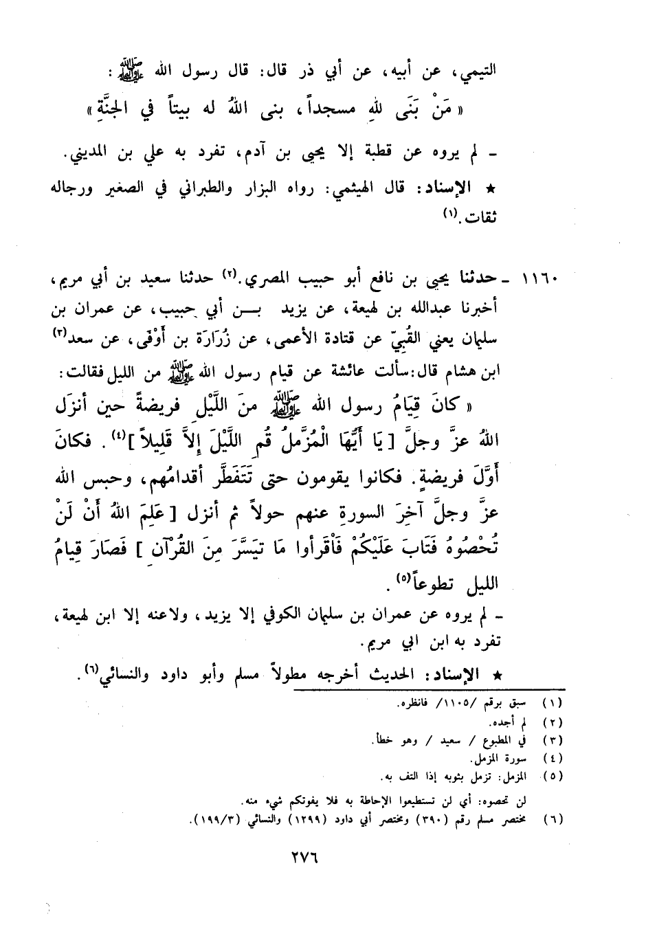 1160 - حَدَّثَنَا يَحْيَى بْنُ نَافِعٍ أَبُو حَبِيبٍ الْمِصْرِيُّ، حَدَّثَنَا سَعِيدُ بْنُ أَبِي مَرْيَمَ، أَخْبَرَنَا عَبْدُ اللَّهِ بْنُ لَهِيعَةَ، عَنْ يَزِيدَ بْنِ أَبِي حَبِيبٍ، عَنْ عِمْرَانَ بْنِ سُلَيْمَانَ يَعْنِي الْقُبِّيَّ، عَنْ قَتَادَةَ الْأَعْمَى، عَنْ زُرَارَةَ بْنِ أَوْفَى، عَنْ سَعْدِ بْنِ هِشَامٍ قَالَ: سَأَلْتُ عَائِشَةَ عَنْ قِيَامِ رَسُولِ اللَّهِ صَلَّى اللَّهُ عَلَيْهِ وَآلِهِ وَسَلَّمَ مِنَ اللَّيْلِ فَقَالَتْ: " §كَانَ قِيَامُ رَسُولِ اللَّهِ صَلَّى اللَّهُ عَلَيْهِ وَآلِهِ وَسَلَّمَ فَرِيضَةً حِينَ أَنْزَلَ اللَّهُ عَزَّ وَجَلَّ {يَا أَيُّهَا الْمُزَّمِّلُ قُمِ اللَّيْلَ إِلَّا قَلِيلًا} [المزمل: 2] , فَكَانَ أَوَّلَ فَرِيضَةٍ , فَكَانُوا يَقُومُونَ حَتَّى تَتَفَطَّرَ أَقْدَامُهُمْ , وَحَبَسَ اللَّهُ عَزَّ وَجَلَّ آخِرَ السُّورَةِ عَنْهُمْ حَوْلًا ثُمَّ أَنْزَلَ {عَلِمَ أَنْ لَنْ تُحْصُوهُ فَتَابَ عَلَيْكُمْ فَاقْرَءُوا مَا تَيَسَّرَ مِنَ الْقُرْآنِ} , فَصَارَ قِيَامُ اللَّيْلِ تَطَوُّعًا لَمْ يَرْوِهِ عَنْ عِمْرَانَ بْنِ سُلَيْمَانَ الْكُوفِيِّ إِلَّا يَزِيدُ , وَلَا عَنْهُ إِلَّا ابْنُ لَهِيعَةَ تَفَرَّدَ بِهِ ابْنُ أَبِي مَرْيَمَ