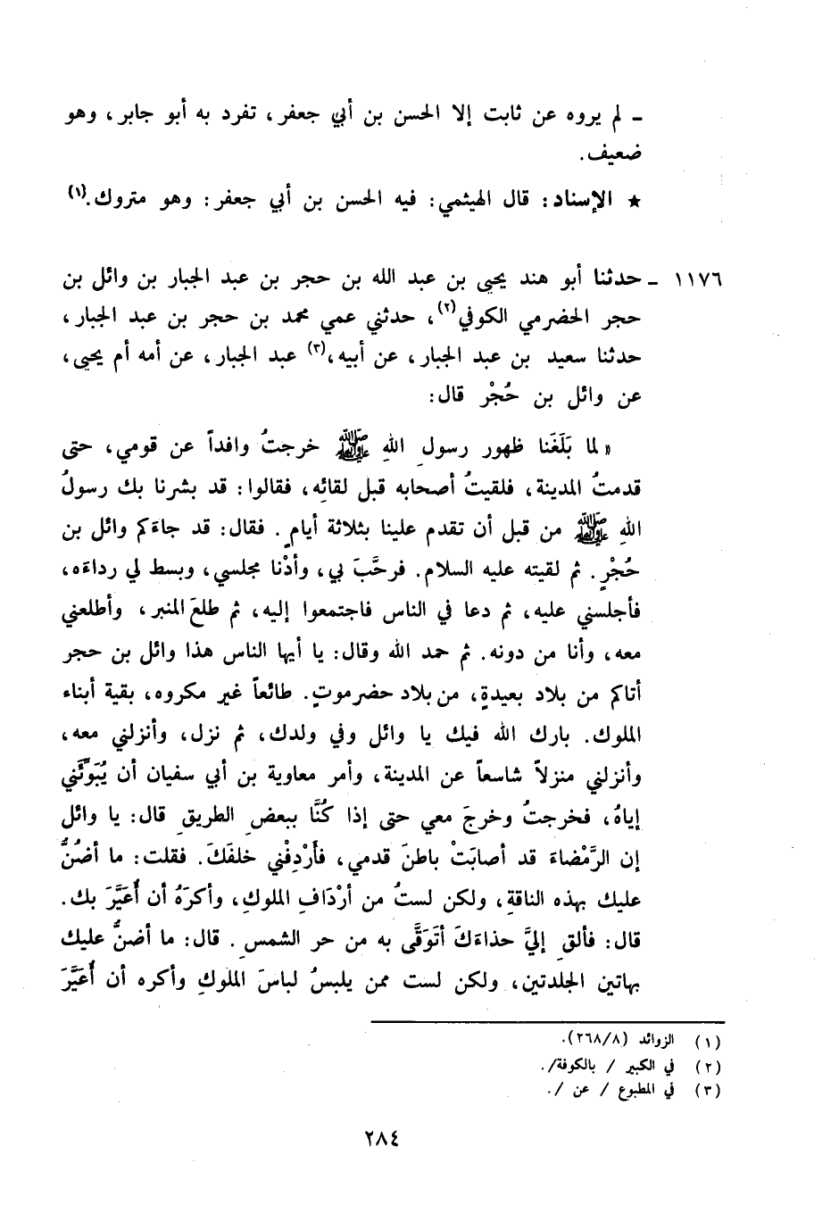 1176 - حَدَّثَنَا أَبُو هِنْدَ يَحْيَى بْنُ عَبْدِ اللَّهِ بْنِ حُجْرِ بْنِ عَبْدِ الْجَبَّارِ بْنِ وَائِلِ بْنِ حُجْرٍ الْحَضْرَمِيُّ الْكُوفِيُّ , حَدَّثَنِي عَمِّي مُحَمَّدُ بْنُ حُجْرِ بْنِ عَبْدِ الْجَبَّارِ , حَدَّثَنَا سَعِيدُ بْنُ عَبْدِ الْجَبَّارِ، عَنْ أَبِيهِ عَبْدِ الْجَبَّارِ، عَنْ أُمِّهِ أُمِّ يَحْيَى، عَنْ وَائِلِ بْنِ حُجْرٍ قَالَ: لَمَّا بَلَغَنَا ظُهُورُ رَسُولِ اللَّهِ صَلَّى اللَّهُ عَلَيْهِ وَآلِهِ وَسَلَّمَ خَرَجْتُ وَافِدًا عَنْ قَوْمِي حَتَّى قَدِمْتُ الْمَدِينَةَ , فَلَقِيتُ أَصْحَابَهُ قَبْلَ لِقَائِهِ , فَقَالُوا: قَدْ بَشَّرَنَا بِكَ رَسُولُ اللَّهِ صَلَّى اللَّهُ عَلَيْهِ وَآلِهِ وَسَلَّمَ مِنْ قَبْلَ أَنْ تَقْدَمَ عَلَيْنَا بِثَلَاثَةِ أَيَّامٍ , فَقَالَ: «قَدْ جَاءَكُمْ وَائِلُ بْنُ حُجْرٍ» , ثُمَّ لَقِيتُهُ عَلَيْهِ السَّلَامُ , فَرَحَّبَ بِي , وَأَدْنَى مَجْلِسِي , وَبَسَطَ لِي رِدَاءَهُ , فَأَجْلَسَنِي عَلَيْهِ , ثُمَّ دَعَا فِي النَّاسِ , فَاجْتَمَعُوا إِلَيْهِ , ثُمَّ طَلَعَ الْمِنْبَرَ , وَأَطْلَعَنِي مَعَهُ وَأَنَا مِنْ دُونِهِ , ثُمَّ حَمِدَ اللَّهَ , وَقَالَ: «يَا أَيُّهَا النَّاسُ , هَذَا وَائِلُ بْنُ حُجْرٍ , أَتَاكُمْ مِنْ بِلَادٍ بَعِيدَةٍ مِنْ بِلَادِ حَضْرَمَوْتَ طَائِعًا غَيْرَ مُكْرَهٍ , بَقِيَّةُ أَبْنَاءِ الْمُلُوكِ , بَارَكَ اللَّهُ فِيكَ يَا وَائِلُ , وَفِي وَلَدِكَ» , ثُمَّ نَزَلَ , وَأَنْزَلَنِي مَعَهُ , وَأَنْزَلَنِي مَنْزِلًا شَاسِعًا عَنِ الْمَدِينَةِ , وَأَمَرَ مُعَاوِيَةَ بْنَ أَبِي سُفْيَانَ أَنْ يُبَوِّئَنِي إِيَّاهُ , فَخَرَجْتُ , وَخَرَجَ مَعِي حَتَّى إِذَا كُنَّا بِبَعْضِ الطَّرِيقِ قَالَ: يَا وَائِلُ , §إِنَّ الرَّمْضَاءَ قَدْ أَصَابَتْ بَاطِنَ قَدَمِي , فَأَرْدِفْنِي خَلْفَكَ , فَقُلْتُ: مَا أَضَنُّ عَلَيْكَ بِهَذِهِ النَّاقَةِ , وَلَكِنْ لَسْتَ مِنْ أَرْدَافِ الْمُلُوكِ , وَأَكْرَهُ أَنْ أُعَيَّرَ بِكَ، قَالَ: فَأَلْقِ إِلَيَّ حِذَاءَكَ أَتَوَقَّى بِهِ مِنْ حَرِّ الشَّمْسِ , قَالَ: مَا أَضَنُّ عَلَيْكَ بِهَاتَيْنِ الْجَلْدَتَيْنِ، وَلَكِنْ لَسْتَ مِمَّنْ يَلْبَسُ لِبَاسَ الْمُلُوكِ , وَأَكْرَهُ أَنْ أُعَيَّرَ -[285]- بِكَ , فَلَمَّا أَرَدْتُ الرُّجُوعَ إِلَى قَوْمِي أَمَرَ لِي رَسُولُ اللَّهِ صَلَّى اللَّهُ عَلَيْهِ وَآلِهِ وَسَلَّمَ بِكُتُبٍ ثَلَاثَةٍ؛ مِنْهَا كِتَابٌ لِي خَالِصٌ: فَضَّلَنِي فِيهِ عَلَى قَوْمِي , وَكِتَابٌ لِأَهْلِ بَيْتِي بِأَمْوَالِنَا هُنَاكَ , وَكِتَابٌ لِي وَلِقَوْمِي فِي كِتَابِي الْخَالِصِ: «بِسْمِ اللَّهِ الرَّحْمَنِ الرَّحِيمِ مِنْ مُحَمَّدٍ رَسُولِ اللَّهِ إِلَى الْمُهَاجِرِ بْنِ أَبِي أُمَيَّةَ أَنَّ وَائِلًا يُسْتَسْعَى وَيَتَرَفَّلُ عَلَى الْأَقْوَالِ حَيْثُ كَانُوا فِي (مِنْ) حَضْرَمَوْتَ» , وَفِي كِتَابِي الَّذِي لِي وَلِأَهْلِ بَيْتِي: «بِسْمِ اللَّهِ الرَّحْمَنِ الرَّحِيمِ مِنْ مُحَمَّدٍ رَسُولِ اللَّهِ إِلَى الْمُهَاجِرِ بْنِ أَبِي أُمَيَّةَ لِأَبْنَاءِ مَعْشَرِ أَبْنَاءِ ضَمْعَاجَ أَقْوَالِ شَنُوءَةَ بِمَا كَانَ لَهُمْ فِيهَا مِنْ مُلْكٍ وَمَوَامِرَ (مَرَامِرَ) وَعِمْرَانَ وَبَحْرٍ وَمِلْحٍ وَمَحْجِرٍ , وَمَا كَانَ لَهُمْ مِنْ مَالٍ اتَّرَثُوهُ بَايَعْتُ , وَمَا لَهُمْ فِيهَا مِنْ مَالٍ بِحَضْرَمَوْتَ أَعْلَاهَا وَأَسْفَلَهَا مِنِّي الذِّمَّةُ وَالْجِوَارُ، اللَّهُ لَهُمْ جَارٌ، وَالْمُؤْمِنُونَ عَلَى ذَلِكَ أَنْصَارٌ» , وَفِي الْكِتَابِ الَّذِي لِي وَلِقَوْمِي: «بِسْمِ اللَّهِ الرَّحْمَنِ الرَّحِيمِ مِنْ مُحَمَّدٍ رَسُولِ اللَّهِ إِلَى وَائِلِ بْنِ حُجْرٍ وَالْأَقْوَالِ الْعَيَاهِلَةِ مِنْ حَضْرَمَوْتَ بِإِقْامِ الصَّلَاةِ , وَإِيتَاءِ الزَّكَاةِ مِنَ الصِّرْمَةِ التَّيْمَةِ وَلِ