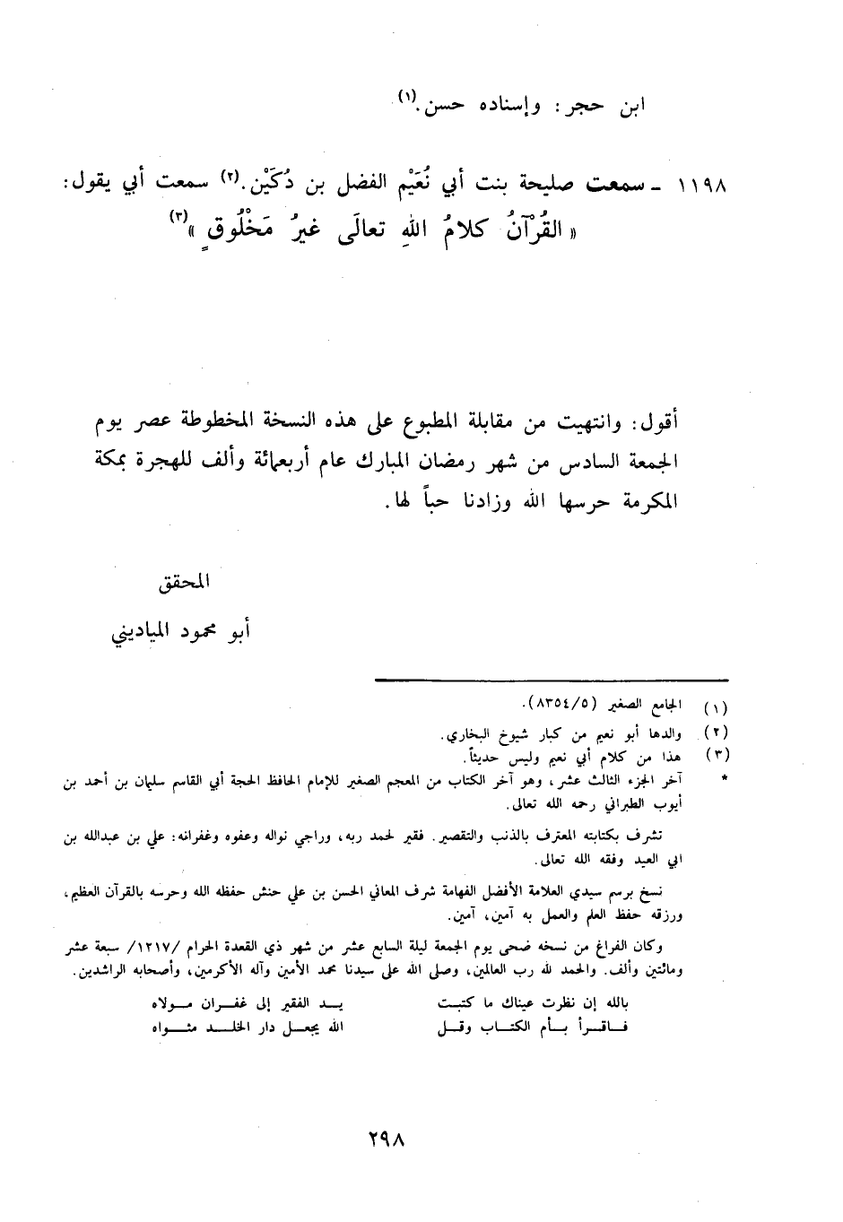 1198 - سَمِعْتُ صُلَيْحَةَ بِنْتَ أَبِي نُعَيْمٍ الْفَضْلِ بْنِ دُكَيْنٍ تَقُولُ: سَمِعْتُ أَبِي يَقُولُ: " §الْقُرْآنُ كَلَامُ اللَّهِ تَعَالَى غَيْرُ مَخْلُوقٍ