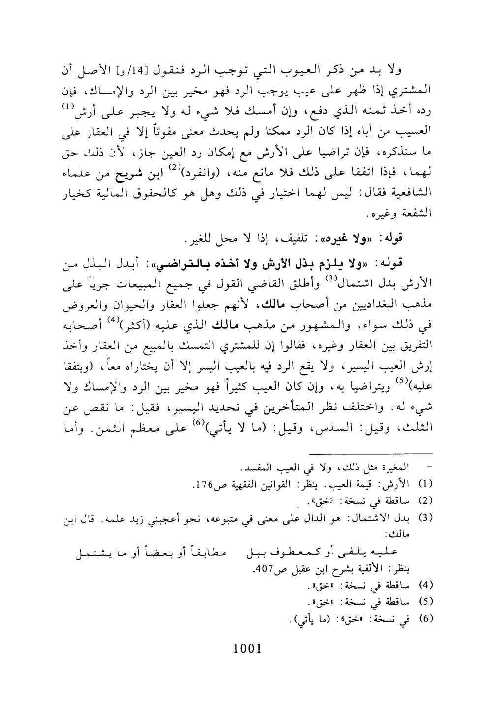 قوله: «ولا يلزم بذل الأرش ولا أخذه بالتراضي»: أبدل البذل من الأرش بدل اشتمال وأطلق القاضي القول في جميع المبيعات جرياً على مذهب البغداديين من أصحاب مالك، لأنهم جعلوا العقار والحيوان والعروض في ذلك سواء، والمشهور من مذهب مالك الذي عليه (أكثر) أصحابه التفريق بين العقار وغيره، فقالوا إن للمشتري التمسك بالمبيع من العقار وأخذ إرش العيب اليسير، ولا يقع الرد فيه بالعيب اليسر إلا أن يختاراه معاً، (ويتفقا عليه) ويتراضيا به، وإن كان العيب كثيراً فهو مخير بين الرد والإمساك ولا شيء له. واختلف نظر المتأخرين في تحديد اليسير، فقيل: ما نقص عن الثلث، وقيل: السدس، وقيل: (ما لا يأتي) على معظم الثمن. وأما