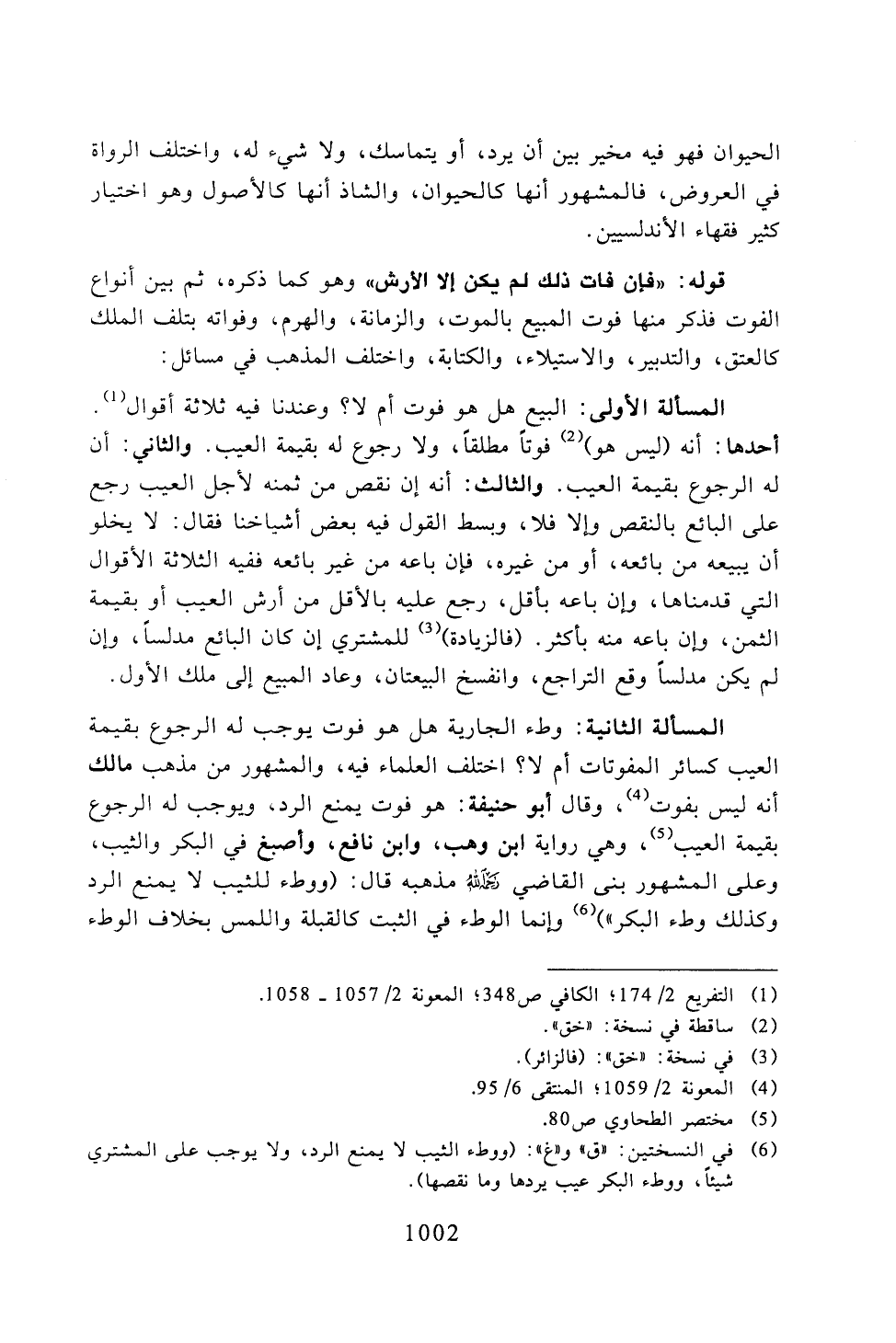 المسألة الثاني: وظء الجارية هل هو فوت يوجب له الرجوع بقيمة العيب كسائر المفوتات أم لا؟ اختلف العلماء فيه، والمشهور من مذهب مالك أنه ليس بفوت، وقال أبو حتنيفة: هو فوت يمنع الرد، ويوجب له الرجوع بقيمة العيب، وهي رواية ابن وهب، وابن نافع، وأصبغ في البكر والثيب، وعلى المشهور بني القاضي رحمه الله مذهبه قال: (ووطء للثيب لا يمنع الرد وكذلك وطء البكر") وإنكا الوطء في الثبت كالقبلة واللمس بخلاف الوطء